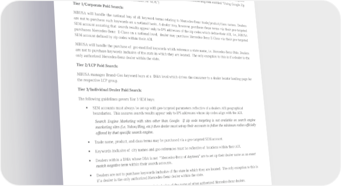 G. Search Engine Marketing (Paid Search): Dealers must establish geo-targeted Search Engine Marketing (SEM) accounts to ensure paid search results appear only to IPS addresses whose zip code aligns with their AOI. (A step-by-step guide including examples to set up a compliant geo-targeted SEM account is available under the “Tier 3 Bonus Program” tab on www.mercedesmarketing.com entitled “Using Google Zip Code Targeting” along with a “Dealer Checklist for SEM.”) Tier 1/Corporate Paid Search: MBUSA will handle the national buy of all keyword terms relating to Mercedes-Benz trade/product/class names. Dealers are not to purchase such keywords on a national basis. A dealer may, however, purchase these terms via their geo-targeted SEM account assuring that search results appear only to IPS addresses of the zip codes which define their AOI, i.e., MBUSA purchases Mercedes-Benz E-Class on a national level; dealer may purchase Mercedes-Benz E-Class via their geo-targeted SEM account defined by zip codes within their AOI. MBUSA will handle the purchase of geo-modified keywords which reference a state name, i.e. Mercedes-Benz Ohio. Dealers are not to purchase keywords inclusive of the state in which they are located. The only exception to this is if a dealer is the only authorized Mercedes-Benz dealer within the state. Tier 2/LCP Paid Search: MBUSA manages Brand+Geo keyword buys at a DMA level which drives the consumer to a dealer locator landing page for the respective LCP group. Tier 3/Individual Dealer Paid Search: The following guidelines govern Tier 3 SEM buys: ƒ SEM accounts must always be set-up with geo-targeted parameters reflective of a dealers AOI geographical boundaries. This assures search results appear only to IPS addresses whose zip codes align with the AOI. Search Engine Marketing with sites other than Google: If zip code targeting is not available on search engine marketing sites (i.e. Yahoo/Bing, etc.) then dealer must set‑up their accounts to follow the minimum radius ofÏcially offered by that specific search engine. ƒ Trade name, product, and class terms may be purchased via a geo-targeted SEM account. ƒ Keywords inclusive of city names and geo-references must be reflective of locations within their AOI. ƒ Dealers within a DMA whose DBA is not “Mercedes-Benz of Anytown” are to set up their dealer name as an exact match negative term within their search accounts. ƒ Dealers are not to purchase keywords inclusive of the state in which they are located. The only exception to this is if a dealer is the only authorized Mercedes-Benz dealer within the state. ƒ Dealers are not to purchase keywords inclusive of the name of other authorized Mercedes-Benz dealers. ƒ Prospects in the process of relocating to an area are to be reached via organic search (SEO). Published August 2015, Rev. 10 Mercedes-Benz Brand Communication Standards l Page 15