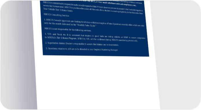 The Mercedes-Benz Communication Consultation Service (MBCCS) has been established for consulting and monitoring services relative to the Mercedes‑Benz New Vehicle Tier 3 Bonus Program. All new vehicle and service Tier 3 marketing questions not specifically addressed in the “Mercedes-Benz Brand Communication Standards” must be submitted to MBCCS for pre-approval prior to placement in the marketplace. The service is available weekdays (excluding holidays) between 9 AM and 4 PM regardless of time zone at 1-800-790-0917, or via e-mail [email protected]. MBCCS is committed to respond to each consult request within 24 hours; however, review of a dealer’s Tier 3 website requires a seven-day turnaround. MBCCS is positioned to assist all Mercedes-Benz dealers in assuring eligibility for the Mercedes-Benz New Vehicle Tier 3 Bonus funds. MBCCS Consulting Service: 1. MBCCS Consult Approvals are binding for 60 days with the exception of Sales Operation’s monthly offers which are valid only for the month indicated in the “Monthly Sales Guide.” MBCCS is not responsible for the following services: 1. VIN and Stock #s: It is assumed that dealers in good faith are listing vehicles at MSRP to assure compliance to MBUSA’s Tier 3 Bonus Program. MSRP, by VIN, will be confirmed during MBCCS’s monitoring process only. 2. Superlative claims: Dealer is responsible to assure that claims can be documented. 3. Questions relative to AOI are to be directed to your Regional Marketing Manager. Published August 2015, Rev. 10 Mercedes-Benz Brand Communication Standards l Page 29