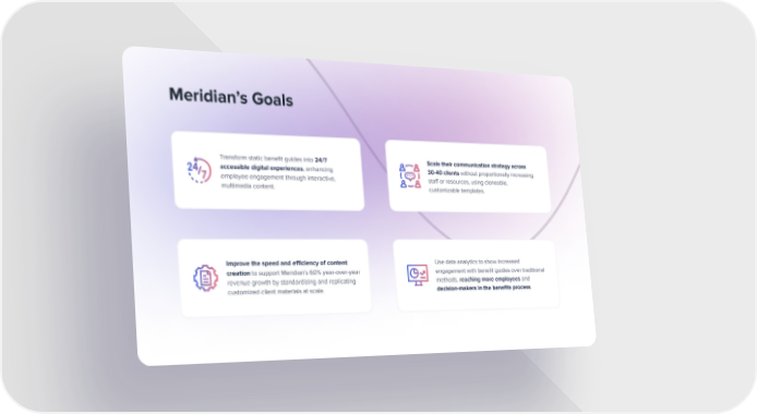 Meridian’s Goals Transform static benefit guides into 24/7 accessible digital experiences, enhancing employee engagement through interactive, multimedia content. Scale their communication strategy across 30-40 clients without proportionally increasing staff or resources, using cloneable, customizable templates. Improve the speed and efficiency of content creation to support Meridian's 60% year-over-year revenue growth by standardizing and replicating customized client materials at scale. Use data analytics to show increased engagement with benefit guides over traditional methods, reaching more employees and decision-makers in the benefits process.