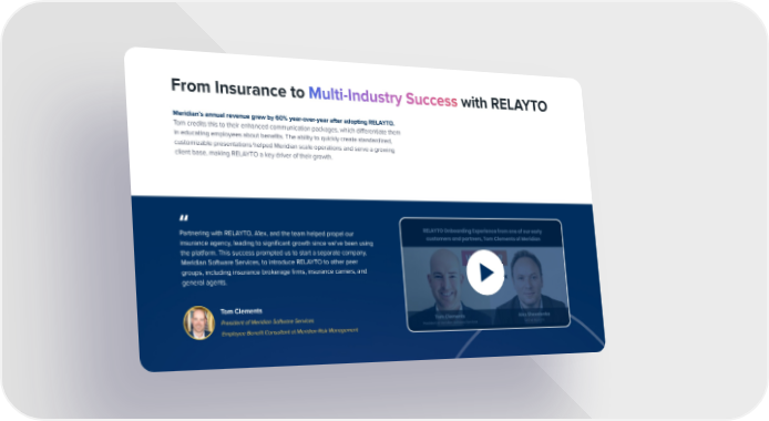 Partnering with RELAYTO, Alex, and the team helped propel our insurance agency, leading to significant growth since we've been using the platform. This success prompted us to start a separate company, Meridian Software Services, to introduce RELAYTO to other peer groups, including insurance brokerage firms, insurance carriers, and general agents. From Insurance to Multi-Industry Success with RELAYTO Meridian’s annual revenue grew by 60% year-over-year after adopting RELAYTO. Tom credits this to their enhanced communication packages, which differentiate them in educating employees about benefits. The ability to quickly create standardized, customizable presentations helped Meridian scale operations and serve a growing client base, making RELAYTO a key driver of their growth. “ Tom Clements President of Meridian Software Services Employee Benefit Consultant at Meridian Risk Management
