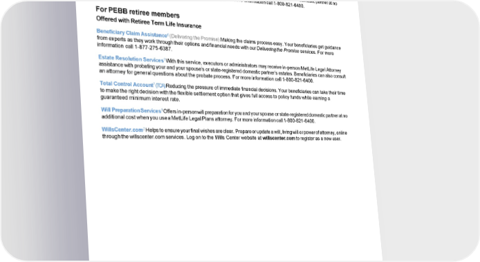 Offered with Supplemental Life Insurance 1 Estate Resolution Services With this service, executors or administrators may receive in-person MetLife Legal Attorney assistance with probating your and your spouse’s or state-registered domestic partner’s estates. Beneficiaries can also consult an attorney for general questions about the probate process. For more information call 1-800-821-6400. 1 Will Preparation Services Offers in-person will preparation for you and your spouse or state-registered domestic partner at no additional cost when you use a MetLife Legal Plans attorney. For more information call 1-800-821-6400. For PEBB retiree members Offered with Retiree Term Life Insurance 6 Beneficiary Claim Assistance (Delivering the Promise) Making the claims process easy. Your beneficiaries get guidance from experts as they work through their options and financial needs with our Delivering the Promise services. For more information call 1-877-275-6387. 1 Estate Resolution Services With this service, executors or administrators may receive in-person MetLife Legal Attorney assistance with probating your and your spouse’s or state-registered domestic partner’s estates. Beneficiaries can also consult an attorney for general questions about the probate process. For more information call 1-800-821-6400. 7 Total Control Account (TCA) Reducing the pressure of immediate financial decisions. Your beneficiaries can take their time to make the right decision with the flexible settlement option that gives full access to policy funds while earning a guaranteed minimum interest rate. 1 Will Preparation Services Offers in-person will preparation for you and your spouse or state-registered domestic partner at no additional cost when you use a MetLife Legal Plans attorney. For more information call 1-800-821-6400. 2 WillsCenter.com Helps to ensure your final wishes are clear. Prepare or update a will, living will or power of attorney, online through the willscenter.com services. Log on to the Wills Center website at willscenter.com to register as a new user.