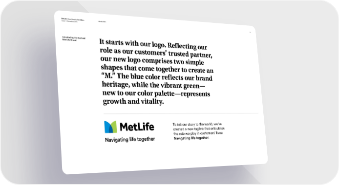 MetLife Visual Identity Guidelines InIntrtroductionoduction 1.4 Issue 1: December 2016 Introducing the Evolved MetLife Brand It starts with our logo. Reflecting our role as our customers’ trusted partner, our new logo comprises two simple shapes that come together to create an “M.” The blue color reflects our brand heritage, while the vibrant green— new to our color palette—represents growth and vitality. To tell our story to the world, we’ve created a new tagline that articulates the role we play in customers’ lives: Navigating life together.