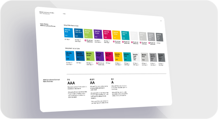 MetLife Visual Identity Guidelines ColorColor 4.5 Issue 1: December 2016 Color Palette Using White Text on Color ADA Compliance Scores MetLife MetLife MetLife MetLife MetLife MetLife MetLife MetLife MetLife MetLife MetLife Blue Dark Blue Green Purple Berry Yellow Teal Light Gray Medium Dark Gray Gray Gray 3.4 6.3 2.0 9.3 5.0 1.6 2.8 1.2 1.5 2.4 4.4 AA 18pt+ AA 18pt+/- Do not use AA 18pt+/- AA 18pt+/- Do not use Do not use Do not use Do not use Do not use AA 18pt+ AAA 18pt+ white text. AAA 18pt+/- AAA 18pt+ white text. white text. white text. white text. white text. Using Black Text on Color MetLife MetLife MetLife MetLife MetLife MetLife MetLife MetLife MetLife MetLife MetLife Blue Dark Blue Green Purple Berry Yellow Teal Light Gray Medium Dark Gray Gray Gray 6.0 3.2 10.5 2.3 4.2 13.3 7.4 17.0 13.6 8.8 4.7 AA 18pt+/- AA 18pt+ AA 18pt+/- Do not use AA 18pt+ AA 18pt+/- AA 18pt+/- AA 18pt+/- AA 18pt+/- AA 18pt+/- AA 18pt+/- AAA 18pt+ AAA 18pt+/- black text. AAA 18pt+/- AAA 18pt+ AAA 18pt+/- AAA 18pt+/- AAA 18pt+/- AAA 18pt+ ADA Compliance Contrast 7:1 4.5:1 3:1 Ratio Overview AAA AA A Required contrast if information is Allowed if the text or information Allowed if the color of an icon essential or descriptive. is recognizable and easy to or a button has a decription or understand. other cues. Allowed with text size below 18pt. If type is 18pt or higher, a 4.5:1 Allowed with text size below 18pt. Allowed if the color is purely ratio is allowed to achieve the If type is 18pt or higher, a 3:1 ratio decorative and can be omitted AAA standard. is allowed to achieve the AA without losing the function. standard. OK to use if the color is inactive user interface or for decoration.