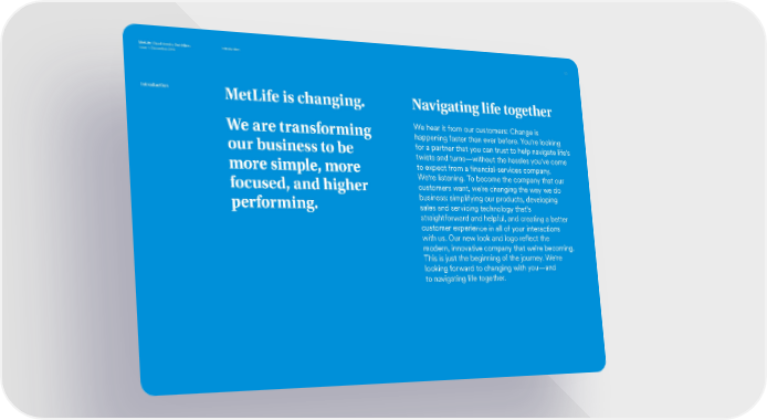 MetLife Visual Identity Guidelines Introduction 1.1 Issue 1: December 2016 Introduction MetLife is changing. Navigating life together We are transforming We hear it from our customers: Change is happening faster than ever before. You're looking our business to be for a partner that you can trust to help navigate life's twists and turns—without the hassles you've come more simple, more to expect from a financial-services company. We're listening. To become the company that our focused, and higher customers want, we're changing the way we do performing. business: simplifying our products, developing sales and servicing technology that's straightforward and helpful, and creating a better customer experience in all of your interactions with us. Our new look and logo reflect the modern, innovative company that we're becoming. This is just the beginning of the journey. We're looking forward to changing with you—and to navigating life together.