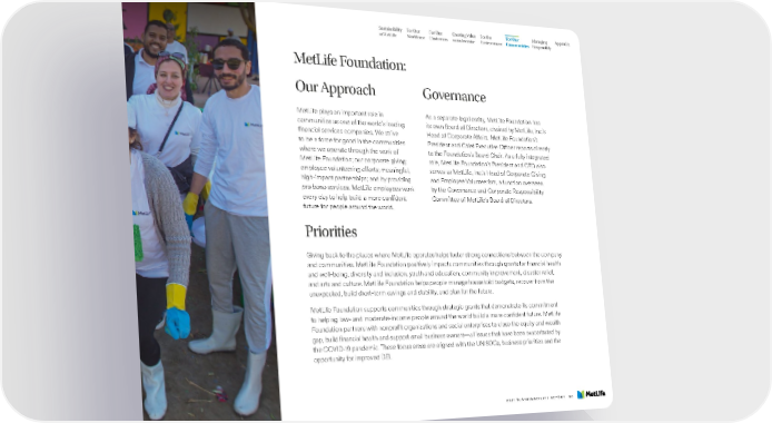 Sustainability For Our For Our Creating Value For the For Our Managing Appendix at MetLife Workforce Customers as an Investor Environment Communities Responsibly MetLife Foundation: Our Approach Governance MetLife plays an important role in As a separate legal entity, MetLife Foundation has communities as one of the world’s leading its own Board of Directors, chaired by MetLife, Inc.’s financial services companies. We strive Head of Corporate Affairs. MetLife Foundation’s to be a force for good in the communities President and Chief Executive Officer reports directly where we operate through the work of to the Foundation’s Board Chair. As a fully integrated MetLife Foundation; our corporate giving; role, MetLife Foundation’s President and CEO also employee volunteering efforts; meaningful, serves as MetLife, Inc.’s Head of Corporate Giving high-impact partnerships; and by providing and Employee Volunteerism, a function overseen pro bono services. MetLife employees work by the Governance and Corporate Responsibility every day to help build a more confident Committee of MetLife’s Board of Directors. future for people around the world. Priorities Giving back to the places where MetLife operates helps foster strong connections between the company and communities. MetLife Foundation positively impacts communities through grants for financial health and well-being, diversity and inclusion, youth and education, community improvement, disaster relief, and arts and culture. MetLife Foundation helps people manage household budgets, recover from the unexpected, build short-term savings and stability, and plan for the future. MetLife Foundation supports communities through strategic grants that demonstrate its commitment to helping low- and moderate-income people around the world build a more confident future. MetLife Foundation partners with nonprofit organizations and social enterprises to close the equity and wealth gap, build financial health and support small business owners—all issues that have been exacerbated by the COVID-19 pandemic. These focus areas are aligned with the UN SDGs, business priorities and the opportunity for improved DEI. 2021 SUSTAINABILITY REPORT 65