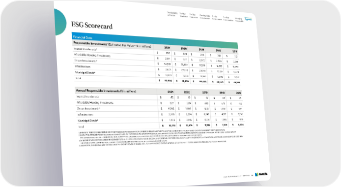 Sustainability For Our For Our Creating Value For the For Our Managing Appendix at MetLife Workforce Customers as an Investor Environment Communities Responsibly ESG Scorecard Financial Data 1 Responsible Investments (Estimated Fair Value—$ in millions) 2021 2020 2019 2018 2017 2 Impact Investments $ 282 $ 243 $ 240 $ 230 $ 212 Affordable Housing Investments $ 2,914 $ 3,111 $ 2,972 $ 2,356 $ 2,219 3 Green Investments $ 34,319 $ 28,672 $ 18,329 $ 16,616 $ 15,059 Infrastructure $ 28,171 $ 27,249 $ 23,318 $ 17,109 $ 15,349 4 Municipal Bonds $ 17,200 $ 15,221 $ 13,586 $ 16,248 $ 17,152 Total $ 82,886 $ 74,496 $ 58,445 $ 52,559 $ 49,991 Annual Responsible Investments ($ in millions) 2021 2020 2019 2018 2017 Impact Investments $ 65 $ 12 $ 13 $ 46 $ 49 Affordable Housing Investments $ 227 $ 200 $ 333 $ 640 $ 182 3 Green Investments $ 6,085 $ 3,883 $ 1,031 $ 1,082 $ 538 Infrastructure $ 2,993 $ 2,574 $ 6,247 $ 4,177 $ 3,216 4 Municipal Bonds $ 4,343 $ 3,945 $ 2,291 $ 1,386 $ 849 Total $ 13,713 $ 10,614 $ 9,915 $ 7,331 $ 4,834 1. MIM MAY PERIODICALLY REFINE OR OTHERWISE MODIFY ITS DEFINITION OF RESPONSIBLE INVESTMENTS AND THE COMPONENTS THEREOF BASED ON DATA AVAILABILITY OR OTHER FACTORS. 2. IMP ACT INVESTMENTS ARE INVESTMENTS MADE WITH THE INTENTION TO GENERATE POSITIVE, MEASURABLE SOCIAL AND ENVIRONMENTAL IMPACT ALONGSIDE A FINANCIAL RETURN (GIIN–GLOBAL IMPACT INVESTMENT NETWORK—DEFINITION). THIS ACTIVITY INCLUDES METLIFE’S GENERAL ACCOUNT AND A SMALLER VOLUME OF METLIFE FOUNDATION ASSETS. 3. MIM CURRENTLY DEFINES GREEN INVESTMENTS TO INCLUDE 1) LEED, ENERGY STAR, BREEAM AND/OR FITWEL CERTIFIED REAL ESTATE EQUITY INVESTMENTS; 2) COMMERCIAL MORTGAGE LOANS SECURED BY LEED AND/ OR ENERGY STAR CERTIFIED REAL ESTATE; 3) RENEWABLE ENERGY PROJECTS, INCLUDING WIND AND SOLAR. 4. MUNICIP AL BONDS INCLUDE TAXABLE AND TAX-EXEMPT REVENUE BONDS AND, TO A MUCH LESSER EXTENT, GENERAL OBLIGATIONS OF STATES, MUNICIPALITIES AND POLITICAL SUBDIVISIONS. 2021 SUSTAINABILITY REPORT 136