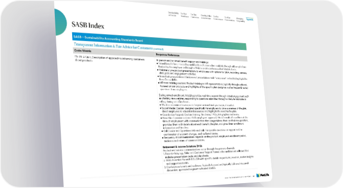 Sustainability For Our For Our Creating Value For the For Our Managing Appendix at MetLife Workforce Customers as an Investor Environment Communities Responsibly SASB Index SASB—Sustainability Accounting Standards Board Transparent Information & Fair Advice for Customers (continued) Code/Metric Response/Reference FN-IN-270a.4, Description of approach to informing customers In-person and/or virtual benefit support and trainings: about products • V irtual benefit fairs: Hosted by qualified benefit counselors available through either a platform hosted by the employer or through a WebEx or teleconference that MetLife hosts. • W ebinars: Live product presentations to employees with options for Q&A, recording, camera, chat, polls and engagement activities. • B rainshark presentations: Customized presentations with “voice over” audio that highlight the benefits available. • HR team tr aining sessions: Product training to HR representatives, typically through webcast, focused on our products and highlights of the specific plan design as well as frequently asked questions from employees. During annual enrollment, MetLife provides real-time support through virtual engagement such as chatting via a webinar, responding to questions submitted through a MetLife microsite or calling during set office hours. • W e also accommodate requests for print material and giveaways, if needed. • Social M edia: Custom-designed specifically for employers to drive awareness of the plan, direct employees to educational resources and highlight the need for the plan. • Coor dinator Support: Custom training, Brochures, FAQs, Infographics and more. • N ew Hire Communications: With employers’ approval, MetLife mails all new hires at the time of employment with communication that congratulates them on their new position, provides them with details about each benefit, the plan, and gives them enrollment information and timeline. • Call Cen ter and Operations: Inbound calls for specific questions or support and/or confirmation of account changes, such as beneficiaries. • F requency of communications depends on the product, employer’s enrollment period, audience and nature of communications. Retirement & Income Solutions (RIS): Product and service communications occur through five primary channels: 1. F ace-to-face, e.g., Sales and Customer Support Teams: sales enablement collateral that includes presentation decks and slip sheets. 2. W eb: A section for each RIS LOB with specific details on products, services, market insights and support materials. 3. Conferences/events and webinars: Topically focused and typically delivered via panel discussion, sponsored segment or hosted WebEx. 2021 SUSTAINABILITY REPORT 105
