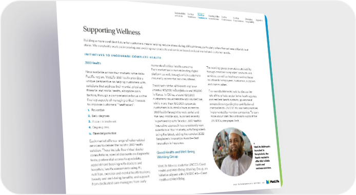 Sustainability For Our For Our Creating Value For the For Our Managing Appendix at MetLife Workforce Customers as an Investor Environment Communities Responsibly Supporting Wellness Building a more confident future for customers means helping reduce stress during difficult times, particularly when the wellness of family is at stake. We constantly work on improving and evolving our products and services based on local market and customer needs. INITIATIVES TO ENCOURAGE COMPLETE HEALTH 360Health moments of critical health concerns. The working group promotes sustainability Each market has a market-leading digital through member companies’ products and Now available across four markets in the Asia- platform as well, through which customers services, as well as healthcare and wellness Pacific region, MetLife 360Health provides a can easily access the services offered. solutions for employees, customers, suppliers unique perspective on helping customers with Downloads of the 360Health app have and communities. solutions that address their mental, physical, crossed 100,000 in Bangladesh and 160,000 Five roundtables were held to discuss the financial and social health, alongside work in Korea. In China, around 620,000 role of the private sector in the health agenda factors, through a comprehensive focus on the customers can access the app on WeChat, and resilient health systems, government five key aspects of managing critical illnesses while more than 100,000 corporate perspectives regarding the contribution of to improve customers’ “healthspan”: customers in Australia have access to companies to UN SDG #3 and best practices 1. Prevention 360Health through the web portal and implemented by member companies. To learn 2. Early diagnosis the new mobile app, launched recently more about MetLife’s actions to support the 3. Access to treatment in partnership with Teladoc. 360Health’s UN SDGs, see pages 8–9. 4. Ongoing care innovative approach has consistently won 5. Financial protection awards in all four markets, with Bangladesh being the latest, adding the coveted 2022 Each market offers a range of value-added Bangladesh Innovation Award—Best services to deliver the holistic 360Health Innovation in Insurance. solution. These include free virtual doctor consultations; special discounts on diagnostic Good Health and Well-Being tests; preferential access to specialists; Working Group appointment booking with doctors and hospitals; health assessments using AI; MetLife Mexico leads the UNGC’s Good nutrition, exercise and mental health trackers; Health and Well-Being Working Group, an beauty and well-being benefits; and support initiative aligned with UN SDG #3—Good from dedicated care managers from early Health and Well-Being. 2021 SUSTAINABILITY REPORT 33