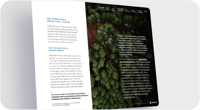 Sustainability For Our For Our Creating Value For the For Our Managing Appendix at MetLife Workforce Customers as an Investor Environment Communities Responsibly ESG INTEGRATION IN AGRICULTURAL LENDING MIM’s Agricultural Finance Group clients provide long-term debt capital for farmers, ranchers, agribusinesses, forest products MetLife is not only identifying opportunities facilities and timberland owners, and we to plant 5 million trees as part of our broader are proud of our role in building resilient 2030 climate goals, we also facilitate communities and supporting sustainable transactions that have financial returns agriculture for more than a century. complemented by ESG outcomes. Although these financial transactions do not contribute ESG INTEGRATION IN to our goal count of 5 million trees, they help PRIVATE EQUITY promote sustainable forest ecosystems in many different ways. MIM’s Next Horizon Manager program is an initiative to support diverse emerging talent. MIM provided financing for a $625 million The program helps female and/or ethnically timberland transaction, consisting of long-term, and racially diverse-owned firms, with a focus first mortgage loans secured by approximately on newer firms that target 50% ownership by 832,000 acres of timberland and timber across females and/or professionals of color, who are looking to raise a fund of $500 million or the Southeastern United States. The financing less. MIM’s Next Horizon Manager program allows Tamarack Timberlands, LLC, which launched with a $50 million annual deployment is owned by Ontario Teachers’ Pension Plan target. MIM has engaged with more than and whose assets are managed by Resource 100 diverse managers and invested with five Management Service, LLC, to complete this of them, for a total of $50 million on behalf of multimillion-dollar redemption transaction 1 MetLife’s general account investment portfolio. and assume direct ownership of its timberland assets in the U.S. South. The approach supports the protection of biodiversity, water and soil resources while contributing to climate change mitigation. 1. FOR A DEFINITION OF GENERAL ACCOUNT, PLEASE SEE EXPLANATORY NOTE ON PAGE 149. 2021 SUSTAINABILITY REPORT 49