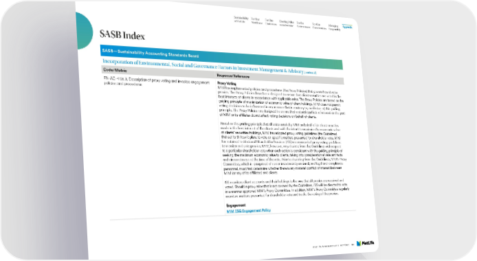 Sustainability For Our For Our Creating Value For the For Our Managing Appendix at MetLife Workforce Customers as an Investor Environment Communities Responsibly SASB Index SASB—Sustainability Accounting Standards Board Incorporation of Environmental, Social and Governance Factors in Investment Management & Advisory (continued) Code/Metric Response/Reference FN-AC-410a.3, Description of proxy voting and investee engagement Proxy Voting policies and procedures MIM has implemented policies and procedures (the Proxy Policies) that govern how it votes proxies. The Proxy Policies have been designed to ensure that client securities are voted in the best interests of clients in accordance with applicable rules. The Proxy Policies are based on the guiding principle of maximization of economic value of client holdings. MIM does not permit voting decisions to be influenced in any manner that is contrary to, or dilutive of, this guiding principle. The Proxy Policies are designed to ensure that material conflicts of interest on the part of MIM or its affiliates do not affect voting decisions on behalf of clients. Based on the guiding principle that all votes made by MIM on behalf of its clients must be made in the best interest of the clients and with the intent to maximize the economic value of clients’ securities holdings, MIM has adopted proxy voting guidelines (the Guidelines) that set forth how it plans to vote on specific matters presented for shareholder vote. MIM has retained Institutional Shareholder Services (ISS) recommended proxy voting guidelines to monitor and vote proxies. MIM, however, may deviate from the Guidelines with respect to a particular shareholder vote when such action is consistent with the guiding principle of seeking the maximum economic value to clients, taking into consideration all relevant facts and circumstances at the time of the vote. Prior to deviating from the Guidelines, MIM’s Proxy Committee, which is comprised of senior investment personnel, and legal and compliance personnel, must first determine whether there is any material conflict of interest between MIM (or any of its affiliates) and clients. ISS monitors client accounts and their holdings to be sure that all proxies are received and voted. Should a proxy arise that is not covered by the Guidelines, ISS will be directed to vote in a manner approved MIM’s Proxy Committee. In addition, MIM’s Proxy Committee regularly monitors matters presented for shareholder vote and tracks the voting of the proxies. Engagement MIM ESG Engagement Policy 2021 SUSTAINABILITY REPORT 100