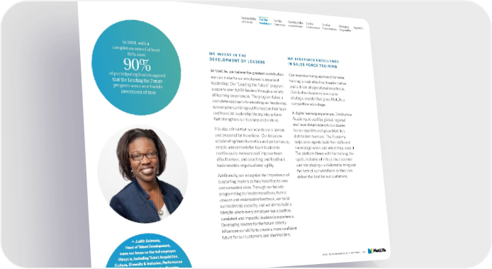 Sustainability For Our For Our Creating Value For the For Our Managing Appendix at MetLife Workforce Customers as an Investor Environment Communities Responsibly In 2021, with a completion rate of at least WE INVEST IN THE WE REDEFINED EXCELLENCE 85%, over DEVELOPMENT OF LEADERS IN SALES FORCE TRAINING 90% At MetLife, we believe the greatest contribution Our award-winning approach for sales of participating leaders agreed we can make to our employees is excellent training is cost effective, transformative that the Leading the Future leadership. Our “Leading the Future” program and a driver of operational excellence. program was a worthwhile supports over 5,500 leaders through a variety Distribution Academy is a crucial investment of time of learning experiences. The program takes a strategic enabler that gives MetLife a complete approach to elevating our leadership competitive advantage. so everyone can bring out the best on their team A digital learning experience, Distribution and translate leadership theory into actions Academy, is used by global, regional that strengthen our business and culture. and local stakeholders to build sales It is also critical that our workforce is nimble force capability and grow MetLife’s and prepared for transitions. Our focus on distribution business. The Academy accelerating team formation and performance, helps sales agents build their skills and simple assessments for team leaders to knowledge when and where they need it. continuously measure and improve team The platform flexes with the training life- effectiveness, and coaching and feedback cycle, inclusive of virtual, local courses tools enables organizational agility. and role playing—all tailored to bring out Additionally, we recognize the importance of the best of our sales force so they can supporting leaders as they transition to new deliver the best for our customers. and expanded roles. Through our holistic programming for leader transitions, formal upward and stakeholder feedback, we build our leadership capacity, and we aim to build a MetLife where every employee has a positive, consistent and impactful leadership experience. Developing leaders for the future directly influences our ability to create a more confident future for our customers and shareholders. 2021 SUSTAINABILITY REPORT 23