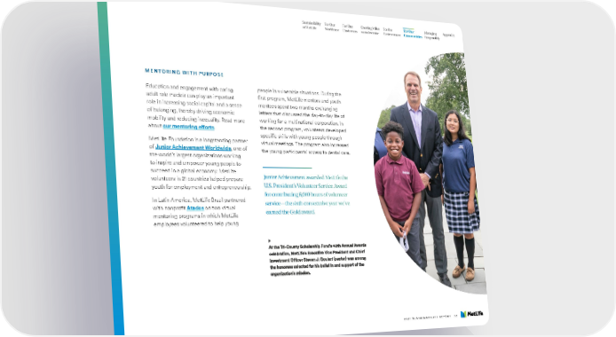 Sustainability For Our For Our Creating Value For the For Our Managing Appendix at MetLife Workforce Customers as an Investor Environment Communities Responsibly MENTORING WITH PURPOSE Education and engagement with caring people in vulnerable situations. During the adult role models can play an important first program, MetLife mentors and youth role in increasing social capital and a sense mentees spent two months exchanging of belonging, thereby driving economic letters that discussed the day-to-day life of mobility and reducing inequality. Read more working for a multinational corporation. In about our mentoring efforts. the second program, volunteers developed specific skills with young people through MetLife Foundation is a longstanding partner virtual meetings. The program also increased of Junior Achievement Worldwide, one of the young participants’ access to dental care. the world’s largest organizations working to inspire and empower young people to succeed in a global economy. MetLife volunteers in 21 countries helped prepare Junior Achievement awarded MetLife the youth for employment and entrepreneurship. U.S. President’s Volunteer Service Award In Latin America, MetLife Brazil partnered for contributing 6,000 hours of volunteer with nonprofit Atados on two virtual service—the sixth consecutive year we’ve mentoring programs in which MetLife earned the Gold award. employees volunteered to help young 2021 SUSTAINABILITY REPORT 73
