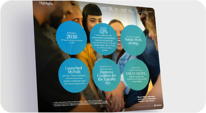 HighlightsHighlights Sustainability For Our For Our Creating Value For the For Our Managing Appendix at MetLife Workforce Customers as an Investor Environment Communities Responsibly Reached 52% Established women within MetLife’s Developed our global 2030 global workforce, and maintained Future Work DEI goals and commitments benchmarked top quartile strategy in 2022 representation for ethnically and 1 2 racially diverse officers in the U.S. and female officers globally Launched Joined the Human Expanded our MyPath Rights Campaign’s sponsorship program, Business EXCELERATE, in the U.S., a talent marketplace Coalition for to foster internal talent globally to advance the mobility, learning and career the Equality development of high-potential development opportunities Act diverse leaders 1. DIVERSE CATEGORIES INCLUDE BLACK/AFRICAN AMERICAN; LATINO/HISPANIC; ASIAN; MULTIRACIAL. 2. THE OFFICER POPULATION IS A SUBSET OF OVERALL MANAGEMENT THAT IS A REFLECTION OF THE LEADERSHIP OF THE ORGANIZATION. IT IS COMPRISED OF ALL METLIFE EMPLOYEES AT THE VICE PRESIDENT LEVEL OR ABOVE. 2021 SUSTAINABILITY REPORT 14