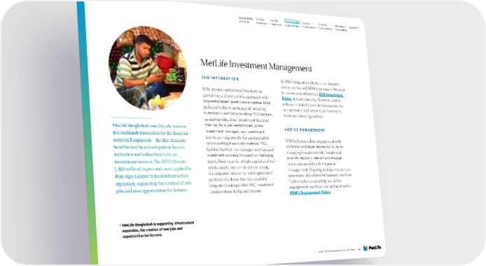 Sustainability For Our For Our Creating Value For the For Our Managing Appendix at MetLife Workforce Customers as an Investor Environment Communities Responsibly MetLife Investment Management ESG INTEGRATION As ESG integration efforts in our industry evolve, so too will MIM’s approach. We seek MIM serves institutional investors by to review and refresh our ESG Investment combining a client-centric approach with Policy at least annually. We work closely long-established asset class expertise. MIM with our clients to provide transparency to believes in the importance of investing our approach and adapt it, as needed, to sustainably and incorporating ESG factors, meet our clients’ guidelines. as appropriate, into investment decision MetLife Bangladesh was the sole investor making. As a well-established global ACTIVE ENGAGEMENT in a landmark transaction for the financial investment manager, our investment sector in Bangladesh—the first domestic teams are responsible for appropriately MIM believes active engagement with incorporating financially material ESG company and issuer leadership is key to bond backed by a development finance factors into their risk management-focused institution and subscribed to by an investment process. Focused on managing managing investment risk. Investment institutional investor. The BDT210 crore public fixed income, private capital and real analysts regularly interact and engage estate assets, we aim to deliver strong, in discussions with a firm’s senior (~$25 million) in proceeds were applied by management. Ongoing dialogue helps raise Pran Agro Limited to local infrastructure risk-adjusted returns by building tailored awareness of sustainable business practices. expansion, supporting the creation of new portfolio solutions that successfully Further details supporting our active jobs and new opportunities for farmers. integrate client-specified ESG investment engagement practices can be found within considerations today and beyond. MIM’s Engagement Policy. > 2021 SUSTAINABILITY REPORT 46