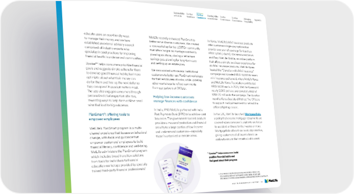 Sustainability For Our For Our Creating Value For the For Our Managing Appendix at MetLife Workforce Customers as an Investor Environment Communities Responsibly educate users on eco-friendly ways MetLife recently enhanced PlanSmart to In Korea, MetLife’s Mini Insurance products to manage their money, and we have better serve diverse customers. We created offer customers single-pay options that established an external advisory council a new workshop for the LGBTQ+ community provide one year of coverage for less than comprised of industry experts who that offers insight on marriage and family KRW 5,000 (~$4.25). We introduced Smart specialize in best practices for improving planning solutions, closing a retirement and Easy MetLife Mobile, an online platform financial health in underserved communities. savings gap, planning for long-term care that offers a simple purchase experience for and setting up an estate plan. six Mini Insurance products. MetLife Korea Upwise™ helps consumers prioritize financial hosted the “Donation with Mini Insurance” goals and suggests simple actions for them We also worked with several institutional campaign and donated KRW 10,000 for every to develop good financial habits, feel more customers to better use PlanSmart workshops mini insurance policy sold, where MetLife Korea optimistic about what their money can for their employees of color, while updating and MetLife Korea Foundation contributed do for them and free up the next dollar so other workshops to reflect comments KRW 5,000 each. In 2021, MetLife Korea sold they can spend it on what matters most. from our partners at OfColor. nearly 2,000 policies and donated a total of The app also engages consumers through KRW 20 million for the campaign. The donation personalized challenges that offer fun, Helping low-income customers went to Korea Society of Retired Fire Officers rewarding ways to help them achieve small manage finances with confidence to support medical treatment for retired fire wins that lead to big outcomes. officers fighting cancer. In India, PNB MetLife partnered with India ® Post Payments Bank (IPPB) to launch low-cost In the U.K., MetLife launched MortgageSafe, PlanSmart : offering tools to empower employees insurance. The government-backed product a policy that ensures mortgage repayments are provides a means of protection and financial covered when someone is unable to work due MetLife’s PlanSmart program is a multi- security to a large portion of low-income to accident or illness for four weeks or more. channel experience that focuses on behavioral and underserved customers—especially MortgageSafe offers three levels of protection, change, with tools and guidance that those in unbanked or remote areas. giving customers of all income levels an empower customers’ employees to build option to secure their most valuable asset. financial literacy, confidence and well-being. MetLife administers the PlanSmart program which includes broad transition solutions > from tools for individuals to financial education workshops provided by specially 1 trained third-party financial professionals. 1. THE FINANCIAL PROFESSIONALS PROVIDING FINANCIAL EDUCATION ARE NOT AFFILIATED WITH METLIFE BUT ARE PROVIDING THE PROGRAM UNDER A SERVICE PROVIDER CONTRACT. 2021 SUSTAINABILITY REPORT 30