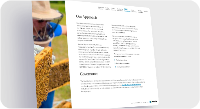 Sustainability For Our For Our Creating Value For the For Our Managing Appendix at MetLife Workforce Customers as an Investor Environment Communities Responsibly Our Approach MetLife’s commitment to environmental We are committed to collaborating with stewardship has been a cornerstone of stakeholders to reduce the risks and effects our 154-year history and is at the heart of climate change, while working toward a of our purpose. Our approach includes a more inclusive future. comprehensive environmental, health and Our employees lead our efforts to achieve safety agenda that considers the need to use our goals within every MetLife department natural resources sustainably and be a force and across every office location. To build for good in the world. a workforce that is fully engaged in our At MetLife, we believe that it is our strategy, we provide training and education responsibility to minimize our carbon footprint. opportunities focused on multiple ESG and We manage and monitor climate risks while sustainability topics. seeking opportunities to leverage our people, Our approach to addressing environmental products, services and investments to support a issues has three focus areas: low-carbon economy and a resilient planet. We support the intention of the Paris Agreement 1. Resilient operations and the recent commitments made at the 2021 2. Protecting communities United Nations Climate Change Conference (COP26) in Glasgow to reduce GHG emissions. 3. Driving climate solutions Governance The MetLife Board of Directors’ Governance and Corporate Responsibility Committee oversees our climate change and environmental strategy and implementation. This responsibility includes reviewing our climate goals, metrics associated with those goals and the MetLife Environmental Policy. MetLife’s senior leadership reports progress on commitments and programs to the Board multiple times per year. 2021 SUSTAINABILITY REPORT 55
