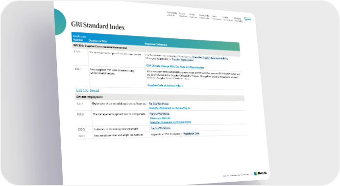 Sustainability For Our For Our Creating Value For the For Our Managing Appendix at MetLife Workforce Customers as an Investor Environment Communities Responsibly GRI Standard Index Disclosure Number Disclosure Title Response/Reference GRI 308: Supplier Environmental Assessment 103-2 The management approach and its components For the Environment >> Resilient Operations >> Promoting Supply Chain Sustainability Managing Responsibly >> Supplier Management CDP Climate Change 2021, C2. Risks and Opportunities 308-1 New suppliers that were screened using 100%: environmental sustainability questions are part of MetLife's standard RFP/RFI templates and environmental criteria are also included in the Supplier Onboarding Process. All suppliers are also expected to adhere to MetLife’s Supplier Code of Business Ethics. Supplier Code of Business Ethics GRI 400: Social GRI 401: Employment 103-1 Explanation of the material topic and its Boundary For Our Workforce MetLife’s Statement on Human Rights 103-2 The management approach and its components For Our Workforce Careers at MetLife MetLife’s Statement on Human Rights 103-3 Evaluation of the management approach For Our Workforce 401-1 New employee hires and employee turnover Appendix >> ESG Scorecard >> Workforce Data 2021 SUSTAINABILITY REPORT 127