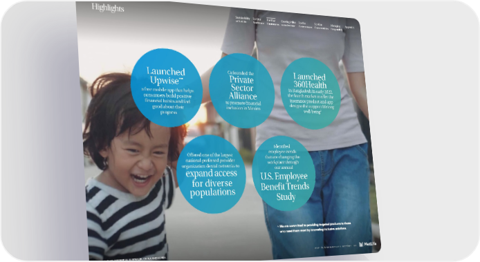 Sustainability For Our For Our Creating Value For the For Our Managing Appendix Highlights at MetLife Workforce Customers as an Investor Environment Communities Responsibly Launched Cofounded the Launched Upwiseâ„¢ Private 360Health Sector in Bangladesh in early 2022, a free mobile app that helps Alliance the fourth market to offer the consumers build positive insurance product and app financial habits and feel to promote financial designed to support lifelong good about their inclusion in Mexico 1 well-being progress Identified Offered one of the largest employee trends national preferred provider that are changing the organization dental networks to workplace through expand access our annual for diverse U.S. Employee populations Benefit Trends Study > 1. ALSO OFFERED IN AUSTRALIA, CHINA AND KOREA 2021 SUSTAINABILITY REPORT 28