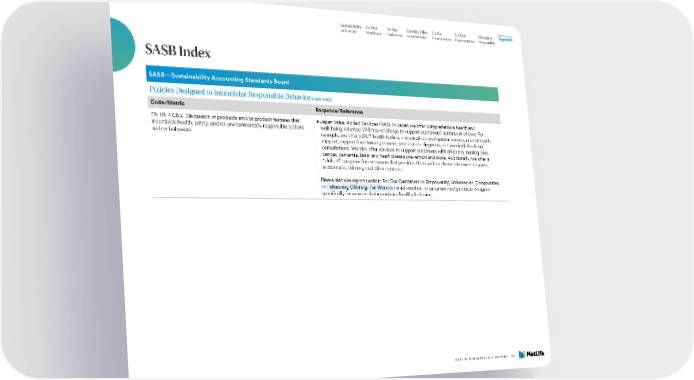 Sustainability For Our For Our Creating Value For the For Our Managing Appendix at MetLife Workforce Customers as an Investor Environment Communities Responsibly SASB Index SASB—Sustainability Accounting Standards Board Policies Designed to Incentivize Responsible Behavior (continued) Code/Metric Response/Reference FN-IN-410b.2, Discussion of products and/or product features that • Japan Value-Added Services (VAS): In Japan we offer comprehensive health and incentivize health, safety, and/or environmentally responsible actions well-being-oriented VAS free of charge to support customers’ continuum of care. For and/or behaviors example, we offer a 24/7 health hotline, a medical second-opinion service, mental health support, support for returning to work post-cancer diagnosis, and medical check-up consultations. We also offer services to support customers with childcare, nursing care, cancer, dementia, brain and heart disease prevention and more. Additionally, we offer a “club off” program for customers that provides them with exclusive discounts to gyms, restaurants, tutoring and other services. Please also see report section: For Our Customers >> Empowering Underserved Communities >> Enhancing Offerings for Women for information on programs and products designed specifically for women that incentivize healthy behavior. 2021 SUSTAINABILITY REPORT 111