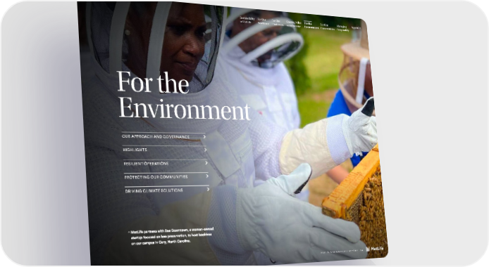 Sustainability For Our For Our Creating Value For the For Our Managing Appendix at MetLife Workforce Customers as an Investor Environment Communities Responsibly For the Environment OUR APPROACH AND GOVERNANCE HIGHLIGHTS RESILIENT OPERATIONS PROTECTING OUR COMMUNITIES DRIVING CLIMATE SOLUTIONS > 2021 SUSTAINABILITY REPORT 54