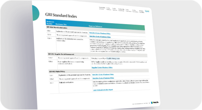 Sustainability For Our For Our Creating Value For the For Our Managing Appendix at MetLife Workforce Customers as an Investor Environment Communities Responsibly GRI Standard Index Disclosure Number Disclosure Title Response/Reference GRI 406: Non-discrimination 103-1 Explanation of the material topic and its Boundary MetLife's Code of Business Ethics 103-2 The management approach and its components MetLife’s Code of Business Ethics 406-1 Incidents of discrimination and corrective MetLife is strongly committed to equal employment opportunity and to administering all terms, actions taken conditions and privileges of employment fairly. We have policies broadly prohibiting discrimination and harassment, provide employees with several avenues to submit complaints, and have robust procedures for investigating those complaints and taking appropriate action if warranted. As a Fortune 50 employer with tens of thousands of employees, MetLife receives complaints from time to time, which are investigated. If warranted, corrective action is taken. Employee complaints and actions taken in response are confidential workplace matters. GRI 414: Supplier Social Assessment 103-2 The management approach and its components Managing Responsibly >> Supplier Management 308-1 New suppliers that were screened using 100%: Supplier social sustainability questions are part of MetLife's standard RFP/RFI templates and environmental criteria are also included in the Supplier Onboarding Process. Supplier Code of Business Ethics GRI 415: Public Policy 103-1 Explanation of the material topic and its Boundary MetLife’s Code of Business Ethics 103-2 The management approach and its components MetLife’s Code of Business Ethics 415-1 Political contributions MetLife forbids political contributions outside the United States without express approval from the Head of Global Government Relations. We made no political contributions outside the United States in 2021. 2021 Political Activities Report 2021 SUSTAINABILITY REPORT 130