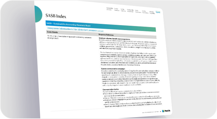 Sustainability For Our For Our Creating Value For the For Our Managing Appendix at MetLife Workforce Customers as an Investor Environment Communities Responsibly SASB Index SASB—Sustainability Accounting Standards Board Transparent Information & Fair Advice for Customers (continued) Code/Metric Response/Reference FN-IN-270a.4, Description of approach to informing customers Employer voluntary benefit insurance products about products MetLife’s employee voluntary benefit insurance products and services are available to businesses with two or more employees via our FINRA-licensed sales team. We provide existing and potential customers with information about products, services and third-party relationships via web pages, webinars, presentations, conferences, videos, newsletters, thought leadership reports, articles and electronic or printed materials. The development and review of materials includes legal, product subject matter experts, and compliance and marketing teams to ensure compliance, accuracy and clarity, and following of regulatory filing standards where appropriate and applicable, based upon various regulating agencies and bodies, such as state departments of insurance, and FINRA and ERISA guidelines for marketing material and plan filings. Information may include specific product details, features, disclaimers, exclusions, and other terms and conditions, as well as general information about MetLife’s brand, corporate functions and financial performance. Custom communication campaigns MetLife is committed to developing custom Group Benefits communications campaigns tailored for each employer, aimed to drive awareness, education and participation. We recommend an omnichannel communications strategy, increasing focus on digital delivery and using offline channels as an important secondary channel. Integrating messages across these channels creates a surround-sound effect that enhances the employee experience. We also have deep experience in building compelling communications for digital channels such as Twitter, LinkedIn, Facebook, microsites, online benefits fairs and emails—and we partner with each employer to craft a step-by-step plan to meet employee’s needs and habits. Communication tactics Product enrollment and service communications plans include: • P ersonalized enrollment kits mailed to employees’ homes, in addition to announcement and reminder email communications. • Custom Micr osite to serve as an educational resource center that all employees can access. • E mployee video(s) to highlight the product details, the need for each benefit, plan benefits and enrollment instructions. • B enefit Decision Guide to help employees evaluate benefit needs by highlighting the value of each benefit and what employees should consider when evaluating their individual and loved one’s needs. 2021 SUSTAINABILITY REPORT 104