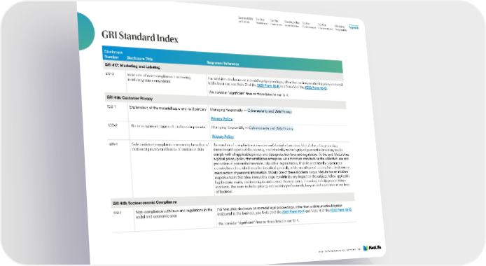 Sustainability For Our For Our Creating Value For the For Our Managing Appendix at MetLife Workforce Customers as an Investor Environment Communities Responsibly GRI Standard Index Disclosure Number Disclosure Title Response/Reference GRI 417: Marketing and Labeling 417-3 Incidents of non-compliance concerning For MetLife’s disclosure on material legal proceedings, other than ordinary routine litigation incidental marketing communications to the business, see Note 21 of the 2021 Form 10-K and Note 14 of the 1Q22 Form 10-Q. We consider “significant” fines as those listed in our 10-K. GRI 418: Customer Privacy 103-1 Explanation of the material topic and its Boundary Managing Responsibly >> Cybersecurity and Data Privacy Privacy Policy 103-2 The management approach and its components Managing Responsibly >> Cybersecurity and Data Privacy Privacy Policy 418-1 Substantiated complaints concerning breaches of The number of complaints received is confidential information. MetLife has a long-standing customer privacy and losses of customer data commitment to protect the security, confidentiality and integrity of personal information, and to comply with all applicable privacy and data protection laws and regulations. To this end, MetLife has a global privacy policy that establishes enterprise-wide minimum standards on the collection, use and protection of personal information. Like other organizations, MetLife occasionally experiences security breaches, which may be described generally as the unauthorized access, loss, disclosure or misdirection of personal information. Should one of these incidents occur, MetLife has an incident response team that takes immediate steps to minimize any impact on the subject, follow applicable legal requirements, and investigate and correct the root cause, if needed, to help prevent future incidents. The team includes privacy and security professionals, lawyers and associates in our lines of business. GRI 419: Socioeconomic Compliance 419-1 Non-compliance with laws and regulations in the For MetLife’s disclosure on material legal proceedings, other than ordinary routine litigation social and economic area incidental to the business, see Note 21 of the 2021 Form 10-K and Note 14 of the 1Q22 Form 10-Q. We consider “significant” fines as those listed in our 10-K. 2021 SUSTAINABILITY REPORT 131