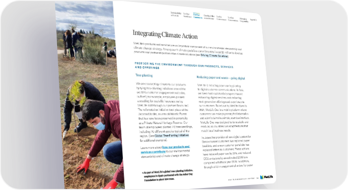 Sustainability For Our For Our Creating Value For the For Our Managing Appendix at MetLife Workforce Customers as an Investor Environment Communities Responsibly Integrating Climate Action MetLife’s products and services are an important component of our environmental stewardship and climate change strategy. Among our 11 climate goals is a commitment to invest $5 million to develop products and partnerships that drive climate solutions (see Driving Climate Solutions). PROTECTING THE ENVIRONMENT THROUGH OUR PRODUCTS, SERVICES AND OFFERINGS Tree planting Reducing paper and waste—going digital We are connecting climate to our products MetLife is reducing paper use by pivoting by tying tree-planting initiatives around the to digital customer communications. In Asia, world to customer engagement and sales. we have made substantial progress toward In Brazil, for example, employees planted enhancing digital services and delivering a seedling for each life insurance policy next-generation offerings and experience to MetLife sold through our partner Banco Itaú. our customers. Rolled out by MetLife Korea in The reforestation initiative took place at the 2021, MetLife One is a mobile platform where Jacarandás site, an area of Atlantic Forest customers can make payments, find information that has now been preserved in perpetuity and submit claims in a simple, seamless interface. as a Private Natural Heritage Reserve. Our MetLife One was designed to be scalable and team of employees planted 712 tree seedlings, modular, so countries can adopt features that including 70 different species typical of the match local business needs. region. (See Global Tree-Planting Initiatives In Japan, the provision of new digital content for for additional examples). Banca channel customers has replaced paper Learn more about how our products and booklets, and a new customer portal site has services contribute to our environmental replaced letters to customers. These actions stewardship and climate change strategy. have reduced paper use by 35%, and reduced CO2 emissions by an estimated 2,108 tons compared with fiscal year 2019. In addition, through strict management of orders for paper 2021 SUSTAINABILITY REPORT 34