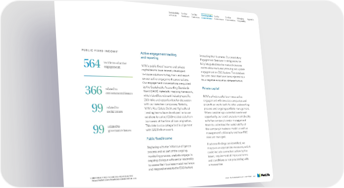Sustainability For Our For Our Creating Value For the For Our Managing Appendix at MetLife Workforce Customers as an Investor Environment Communities Responsibly 1 PUBLIC FIXED INCOME Active engagement tracking impacting their business. Our proprietary and reporting Engagement Database is designed to be fully integrated into the research process incidents of active MIM’s public fixed income and private and to allow each analyst to log and update 564 engagement: capital teams have recently developed engagement on ESG factors. The database in-house solutions to tag, track and report includes deals that have been rejected due on our active engagement conversations. to a negative evaluation of these factors. Our engagement conversations are guided by the Sustainable Accounting Standards Private capital related to Board (SASB) materiality mapping framework, 366 environmental issues which identifies relevant industry-specific MIM’s private capital team sees active ESG risks and opportunities for discussion engagement with investee companies and with our investee companies. Notably, projects as key to both its initial underwriting 99 related to MIM’s Real Estate Debt and Agricultural process and ongoing portfolio management. social issues Lending teams have developed in-house When considering a potential investment solutions to collect ESG-related data from opportunity, our credit analysts meet directly borrowers at the time of loan origination. with the company’s senior management related to This data is also categorized in alignment team to understand the sustainability of 99 governance issues with SASB’s framework. the company’s business model as well as management’s philosophy and how ESG Public fixed income risks are managed. Beginning with the initial due diligence If adverse findings are identified, we process and as part of the ongoing may pursue appropriate measures, which monitoring process, analysts engage in could include corrective action by the ongoing dialogue with senior leadership issuer, requirement of improved terms to assess their business model resilience and conditions or not proceeding with and responsiveness to the ESG factors a transaction. 1. MIM PUBLIC FIXED INCOME ESG-RELATED ACTIVE ENGAGEMENT CONVERSATIONS CONDUCTED IN 2021. 2021 SUSTAINABILITY REPORT 47