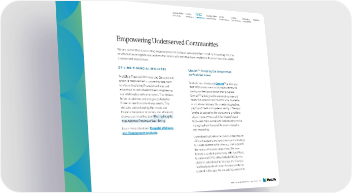 Sustainability For Our For Our Creating Value For the For Our Managing Appendix at MetLife Workforce Customers as an Investor Environment Communities Responsibly Empowering Underserved Communities We are committed to providing targeted products to those who need them most by innovating inclusive solutions that recognize and address the historical biases that have resulted in financial inequities within underserved populations. DRIVING FINANCIAL WELLNESS Upwise™: lowering the temperature on financial stress MetLife’s Financial Wellness and Engagement group is responsible for powering long-term MetLife has introduced Upwise™, a free app solutions that bring financial wellness and that helps consumers build positive financial education to individuals while strengthening habits and feel good about their progress. our relationship with employers. The division Upwise™ is designed to connect consumers’ helps us address and design solutions for behaviors around common financial concerns financial health and wellness needs. This or emotional stresses like monthly budgeting, includes understanding the needs and paying off debt or long-term savings. The app financial behaviors of racially and ethnically begins by assessing the consumer’s emotions diverse communities (see Sharing Insights about money—we call it the Money Mood that Address Employee Well-Being). tool—and then works with individuals to make Learn more about our Financial Wellness managing their financial life more enjoyable and Engagement products. and rewarding. Understanding that some communities require different support, we have developed a strategy to create content within the app that supports the needs of diverse consumers. We have formed a content partnership with Yemi Rose, founder and CEO of the fintech OfColor—a platform established to improve the financial health of people of color—to incorporate its content in the app. We are adding content to 2021 SUSTAINABILITY REPORT 29