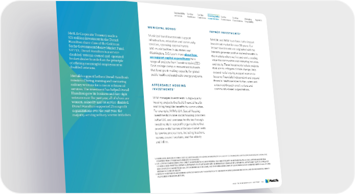 Sustainability For Our For Our Creating Value For the For Our Managing Appendix at MetLife Workforce Customers as an Investor Environment Communities Responsibly 1 3 MUNICIPAL BONDS IMPACT INVESTMENTS MetLife Corporate Treasury made a Municipal bond investments support MetLife and MIM have been in the impact $25 million investment in the Drexel infrastructure, education and community investment market for over 35 years. Our Hamilton share class of the Goldman services, spanning approximately impact investments are originated with the Sachs Government Money Market Fund, 300 municipalities in 44 states and intent to generate positive societal benefits in VETXX. Drexel Hamilton is a service- Washington, D.C. Learn more about how the markets where we live and work, creating disabled, veteran-owned and -operated we support capital expenditures for a value for communities and catalyzing inclusion broker-dealer founded on the principle range of projects from investments in LEED and equity. These investments include projects of offering meaningful employment to Gold college campus renovations to bonds that aim to mitigate climate change, help disabled veterans. that fund grant-making capacity for global expand racial equity, support women to public health and sustainable energy programs. become financially independent and expand MetLife’s support furthers Drexel Hamilton’s financial health services to the under- and mission of hiring, training and mentoring AFFORDABLE HOUSING unbanked through credit unions and military veterans for a career in financial community-based organizations. 2 services. The investment has helped Drexel INVESTMENTS Hamilton grow its business and hire eight veterans over the past year, all of whom are MIM manages investments in high-quality women, minority and/or service-disabled. housing projects that build financial health Drexel Hamilton supported 25 nonprofit and bring tangible benefits to communities. organizations over the past year, the For example, MIM’s U.K. Social Housing majority serving military veteran initiatives. investments involve social housing providers in the U.K. and overseas territories through investments in nonprofit organizations that provide rental homes at below-market rents to low-income earners, including teachers, nurses, council workers, and the elderly and infirm. 1. A MUNICIPAL BOND IS A PUBLIC DEBT SECURITY ISSUED BY A STATE, MUNICIPALITY OR COUNTY TO FINANCE ITS CAPITAL EXPENDITURES, INCLUDING THE CONSTRUCTION OF HIGHWAYS, BRIDGES OR SCHOOLS. 2. U.S. LOW INCOME HOUSING TAX CREDIT INVESTMENTS INCLUDE FEDERAL TAX CREDIT EQUITY INVESTMENTS, FINANCING AFFORDABLE RENTAL HOUSING AND STATE TAX CREDIT INVESTMENTS THAT ARE MADE WITH SUBSTANTIALLY SIMILAR REQUIREMENTS. AFFORDABLE UNITS IN A PROJECT MAY CHARGE NO MORE THAN 30% OF A HOUSEHOLD’S INCOME, AND THE AVERAGE INCOME OF ALL HOUSEHOLDS IN ASSISTED UNITS IS 60% OF AREA MEDIAN INCOME OR BELOW. 3. IMPACT INVESTMENTS ARE DEFINED AS THOSE MADE WITH THE INTENTION TO GENERATE POSITIVE, MEASURABLE SOCIAL AND ENVIRONMENTAL IMPACT ALONGSIDE A FINANCIAL RETURN. 2021 SUSTAINABILITY REPORT 52