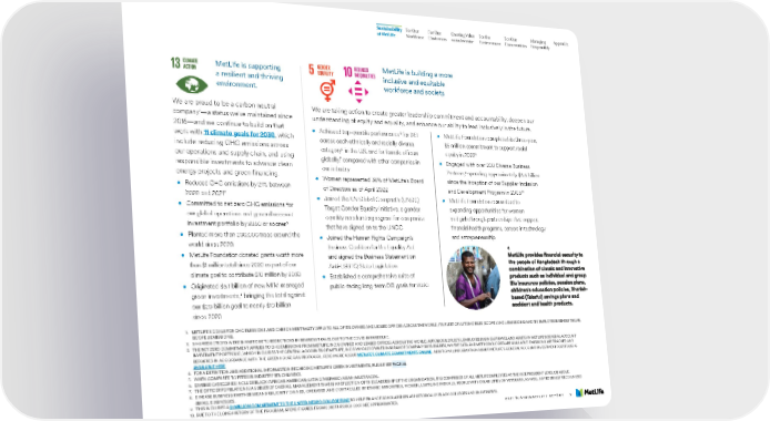 Sustainability For Our For Our Creating Value For the For Our Managing Appendix at MetLife Workforce Customers as an Investor Environment Communities Responsibly MetLife is supporting MetLife is building a more a resilient and thriving inclusive and equitable environment. workforce and society. We are proud to be a carbon neutral We are taking action to create greater leadership commitment and accountability, deepen our 1 company—a status we’ve maintained since understanding of equity and equality, and enhance our ability to lead inclusively in the future. 2016—and we continue to build on that 5 work with 11 climate goals for 2030, which • Achieved top-quartile performance for DEI • MetLife Foundation completed its three-year, include reducing GHG emissions across across each ethnically and racially diverse $5 million commitment to support racial 6 9 our operations and supply chain, and using category in the U.S. and for female officers equity in 2022 7 responsible investments to advance clean globally, compared with other companies in • Engaged with over 200 Diverse Business energy projects and green financing. our industry Partners,8 spending approximately $3.5 billion • Women represented 38% of MetLife’s Board since the inception of our Supplier Inclusion • Reduced GHG emissions by 21% between of Directors as of April 2022 and Development Program in 200310 2020 and 20212 • Joined the UN Global Compact’s (UNGC) • MetLife Foundation committed to • Committed to net zero GHG emissions for Target Gender Equality Initiative, a gender- expanding opportunities for women our global operations and general account equality accelerator program for companies and girls through partnerships that support investment portfolio by 2050 or sooner3 that have signed on to the UNGC financial health programs, careers in technology • Planted more than 200,000 trees around the • Joined the Human Rights Campaign’s and entrepreneurship world since 2020 Business Coalition for the Equality Act • MetLife Foundation donated grants worth more and signed the Business Statement on than $1 million total since 2020 as part of our Anti-LGBTQ State Legislation climate goal to contribute $10 million by 2030 • Established a comprehensive suite of • Originated $6.1 billion of new MIM-managed public-facing long-term DEI goals for 2030 4 green investments, bringing the total against our $20 billion goal to nearly $10 billion since 2020 1. METLIFE’S GOALS FOR GHG EMISSIONS AND CARBON NEUTRALITY APPLY TO ALL OF ITS OWNED AND LEASED OFFICES ACROSS THE WORLD, ITS FLEET OF AUTOMOBILES (SCOPE 1 AND 2 EMISSIONS) AND ITS EMPLOYEE BUSINESS TRAVEL (SCOPE 3 EMISSIONS). 2. GHG REDUCTIONS WERE IN PART DUE TO REDUCTIONS IN BUSINESS TRAVEL DUE TO THE COVID-19 PANDEMIC. 3. THE NET ZERO COMMITMENT APPLIES TO GHG EMISSIONS FROM METLIFE, INC.’S OWNED AND LEASED OFFICES ACROSS THE WORLD, AUTOMOBILE FLEETS, EMPLOYEE BUSINESS TRAVEL AND ASSETS IN METLIFE’S GENERAL ACCOUNT INVESTMENT PORTFOLIO, WHICH INCLUDES THE GENERAL ACCOUNTS OF METLIFE, INC.’S WHOLLY OWNED INSURANCE COMPANY SUBSIDIARIES, WHERE DATA AND METHODOLOGIES ARE AVAILABLE. EMISSIONS ARE TRACKED AND REPORTED IN ACCORDANCE WITH THE GREENHOUSE GAS PROTOCOL. READ MORE ABOUT METLIFE’S CLIMATE COMMITMENTS ONLINE. ADDITIONAL INFORMATION ABOUT METLIFE’S GENERAL ACCOUNT INVESTMENT PORTFOLIO IS AVAILABLE HERE. 4. FOR A DEFINITION AND ADDITIONAL INFORMATION REGARDING METLIFE’S GREEN INVESTMENTS, PLEASE SEE PAGE 90. 5. WHEN COMPARED TO PEERS IN INDUSTRY BENCHMARKS. 6. DIVERSE CATEGORIES INCLUDE BLACK/AFRICAN AMERICAN; LATINO/HISPANIC; ASIAN; MULTIRACIAL. 7. THE OFFICER POPULATION IS A SUBSET OF OVERALL MANAGEMENT THAT IS A REFLECTION OF THE LEADERSHIP OF THE ORGANIZATION. IT IS COMPRISED OF ALL METLIFE EMPLOYEES AT THE VICE PRESIDENT LEVEL OR ABOVE. 8. DIVERSE BUSINESS PARTNER MEANS MAJORITY OWNED, OPERATED AND CONTROLLED BY ETHNIC MINORITIES, WOMEN, LGBTQ INDIVIDUALS, PEOPLE WITH DISABILITIES OR VETERANS, AS WELL AS FEDERALLY RECOGNIZED SMALL BUSINESSES. 9. THIS INCLUDES A $1 MILLION COMMITMENT TO THE UNITED NEGRO COLLEGE FUND TO HELP FINANCE SCHOLARSHIPS AT HISTORICALLY BLACK COLLEGES AND UNIVERSITIES. 10. DUE TO THE LONG HISTORY OF THE PROGRAM, SPEND FIGURES FROM 2003 THROUGH 2007 ARE APPROXIMATED. 2021 SUSTAINABILITY REPORT 9