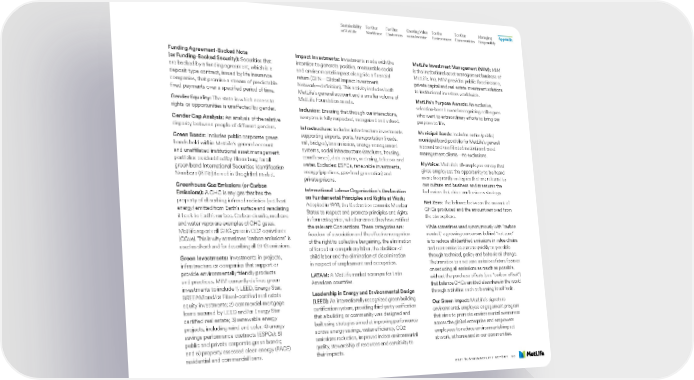 Sustainability For Our For Our Creating Value For the For Our Managing Appendix at MetLife Workforce Customers as an Investor Environment Communities Responsibly Funding Agreement-Backed Note Impact Investments: Investments made with the MetLife Investment Management (MIM): MIM (or Funding-Backed Security): Securities that intention to generate positive, measurable social is the institutional asset management business of are backed by a funding agreement, which is a and environmental impact alongside a financial MetLife. Inc. MIM provides public fixed income, deposit-type contract, issued by life insurance return (GIIN—Global Impact Investment private capital and real estate investment solutions companies, that promise a stream of predictable Network—definition). This activity includes both to institutional investors worldwide. fixed payments over a specified period of time. MetLife’s general account and a smaller volume of MetLife’s Purpose Awards: An exclusive, Gender Equality: The state in which access to MetLife Foundation assets. selection-based award recognizing colleagues rights or opportunities is unaffected by gender. Inclusion: Ensuring that through our interactions, who went to extraordinary efforts to bring our Gender Gap Analysis: An analysis of the relative everyone is fully respected, recognized and valued. purpose to life. disparity between people of different genders. Infrastructure: Includes infrastructure investments Municipal Bonds: Includes entire (public) Green Bonds: Includes public corporate green supporting airports, ports, transportation (roads, municipal bond portfolio for MetLife’s general bonds held within MetLife’s general account rail, bridges), transmission, energy management account and unaffiliated institutional asset and unaffiliated institutional asset management systems, social infrastructure (stadiums, housing, management clients—no exclusions. portfolios as identified by Bloomberg for all courthouses), data centers, metering, telecom and MyVoice: MetLife’s all-employee survey that green bond International Securities Identification water. Excludes: ESPCs, renewable investments, gives employees the opportunity to be heard Numbers (ISINs) issued in the global market. energy (pipelines, gas-fired generation) and more frequently on topics that are relevant to private prisons. our culture and business and measures the Greenhouse Gas Emissions (or Carbon International Labour Organization’s Declaration behaviors that drive our business strategy. Emissions): A GHG is any gas that has the on Fundamental Principles and Rights at Work: property of absorbing infrared radiation (net heat Adopted in 1998, the Declaration commits Member Net Zero: The balance between the amount of energy) emitted from Earth’s surface and reradiating States to respect and promote principles and rights GHGs produced and the amount removed from it back to Earth’s surface. Carbon dioxide, methane in four categories, whether or not they have ratified the atmosphere. and water vapor are examples of GHG gases. the relevant Conventions. These categories are: While sometimes used synonymously with “carbon MetLife reports all GHG gases in CO2 equivalents freedom of association and the effective recognition neutral,” a growing consensus behind “net zero” (CO2e). This is why sometimes “carbon emissions” is of the right to collective bargaining, the elimination is to reduce all identified emissions in value chains used as shorthand for describing all GHG emissions. of forced or compulsory labor, the abolition of and economies to zero as quickly as possible Green Investments: Investments in projects, child labor and the elimination of discrimination through technical, policy and behavioral change. infrastructure or companies that support or in respect of employment and occupation. The transition to a net zero emissions future focuses provide environmentally friendly products LATAM: A MetLife market acronym for Latin on reducing all emissions as much as possible, and practices. MIM currently defines green American countries. without the purchase offsets (see “carbon offset”) investments to include 1) LEED, Energy Star, that balance GHGs emitted elsewhere in the world BREEAM and/or Fitwel-certified real estate Leadership in Energy and Environmental Design through activities such as burning fossil fuels. equity investments; 2) commercial mortgage (LEED): An internationally recognized green building Our Green Impact: MetLife’s signature loans secured by LEED and/or Energy Star certification system, providing third-party verification environmental employee engagement program certified real estate; 3) renewable energy that a building or community was designed and that aims to promote environmental awareness projects, including wind and solar; 4) energy built using strategies aimed at improving performance across the global enterprise and empowers savings performance contracts (ESPCs); 5) across energy savings, water efficiency, CO2 employees to reduce environmental impact public and private corporate green bonds; emissions reduction, improved indoor environmental at work, at home and in our communities. and 6) property assessed clean energy (PACE) quality, stewardship of resources and sensitivity to residential and commercial loans. their impacts. 2021 SUSTAINABILITY REPORT 90