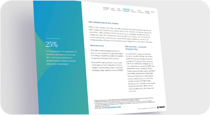 Sustainability For Our For Our Creating Value For the For Our Managing Appendix at MetLife Workforce Customers as an Investor Environment Communities Responsibly ESG INTEGRATION IN REAL ESTATE MIM has been involved in real estate since 1878, and today provides debt and equity origination and asset management capabilities across offices in the U.S. and international markets, including the U.K., Japan, Korea, Chile and Mexico. MIM embraces our role as a responsible real estate investment manager and lender. We understand the impact buildings have on people, communities and the environment. We also know that issues such as climate change, regulatory environments and building operational efficiencies will increasingly impact lending decisions and financial performance. 25% Real estate equity Real estate debt—commercial mortgage lending MIM offers investors strategies that seek to 1 of all investments were powered with achieve income growth and capital appreciation Our commercial mortgage loan business renewable electricity as of year-end by investing in competitively positioned properties has a focus on office buildings, retail centers, 2021, and a power-procurement in markets with favorable demand drivers. apartment complexes, industrial properties strategy was put in place to increase Multiple MIM equity portfolios have achieved and hotels. For example, MIM originated a green power procurement. 5-Star status and been designated as “Sector $180 million commercial mortgage loan on Leaders” over the past two years in the Global Heron Water Street, a newly built LEED Gold apartment building in downtown Tampa, 2 Real Estate Sustainability Benchmark (GRESB). 3 Florida, in the heart of the world’s first WELL pre-certified neighborhood, Water Street Tampa, which envisions a sustainable and environmentally friendly community. The property includes smart thermostats, WaterSense plumbing fixtures, solar shades, Energy Star appliances, electric vehicle charging stations and a bike storage and repair room. 1. MIM SURVEYED TENANTS TO ASSESS THEIR INTEREST IN PARTICIPATING IN THE ENERGY STAR TENANT SPACE RECOGNITION PROGRAM. REPRESENTS PERCENTAGE OF SUCH MIM-MANAGED AND -CONTROLLED REAL ESTATE INVESTMENTS. 2. GRESB ISSUES AN ANNUAL ASSESSMENT BENCHMARKING PROPERTIES’ PERFORMANCE IN ACHIEVING ESG GOALS AND COMPARES EACH SECTOR’S PROGRESS IN ACHIEVING GLOBAL SUSTAINABILITY STANDARDS. THE TOP 20% WITHIN EACH SECTOR OF THE BENCHMARK RECEIVES THE FIVE-STAR RATING. 3. LEARN MORE ABOUT THE WELL COMMUNITY STANDARD. 2021 SUSTAINABILITY REPORT 48