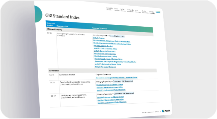 Sustainability For Our For Our Creating Value For the For Our Managing Appendix at MetLife Workforce Customers as an Investor Environment Communities Responsibly GRI Standard Index Disclosure Number Disclosure Title Response/Reference Ethics and Integrity 102-16 Values, principles, standards, and norms Managing Responsibly >> Code of Business Ethics of behavior MetLife Purpose MetLife Financial Management Code of Business Ethics MetLife Director’s Code of Business Conduct and Ethics MetLife Corporate Conduct MetLife’s Code of Business Ethics MetLife Corporate Governance MetLife Ethics and Compliance MetLife Customer Privacy Policy MetLife Supplier Code of Business Ethics Governance and Corporate Responsibility Committee Charter MetLife’s Statement on Human Rights MetLife Pay Equity Statement Governance 102-18 Governance structure Corporate Governance Governance and Corporate Responsibility Committee Charter 102-20 Executive-level responsibility for economic, Managing Responsibly >> Governance; Risk Management environmental, and social topics MetLife Statement on Climate Change MetLife’s Statement on Human Rights MetLife’s Environmental Policy Statement 102-29 Identifying and managing economic, Managing Responsibly >> Governance; Risk Management environmental, and social impacts MetLife Statement on Climate Change MetLife’s Statement on Human Rights MetLife’s Environmental Policy Statement 2021 SUSTAINABILITY REPORT 119