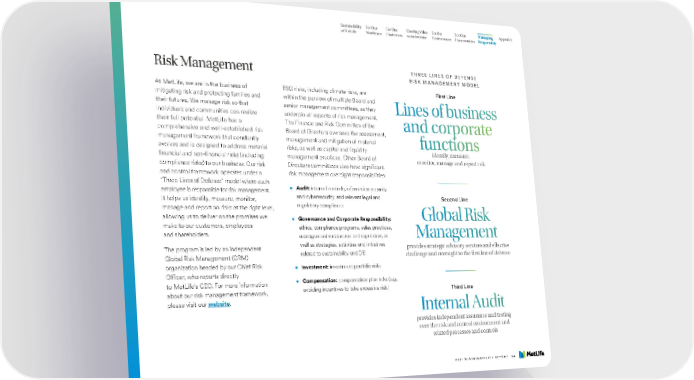 Sustainability For Our For Our Creating Value For the For Our Managing Appendix at MetLife Workforce Customers as an Investor Environment Communities Responsibly Risk Management THREE LINES OF DEFENSE RISK MANAGEMENT MODEL At MetLife, we are in the business of ESG risks, including climate risks, are First Line mitigating risk and protecting families and within the purview of multiple Board and their futures. We manage risk so that senior management committees, as they Lines of business individuals and communities can realize underpin all aspects of risk management. their full potential. MetLife has a The Finance and Risk Committee of the and corporate comprehensive and well-established risk Board of Directors oversees the assessment, management framework that constantly management and mitigation of material functions evolves and is designed to address material risks, as well as capital and liquidity identify, measure, financial and non-financial risks (including management practices. Other Board of monitor, manage and report risk compliance risks) to our business. Our risk Directors committees also have significant and control framework operates under a risk management oversight responsibilities: “Three Lines of Defense” model where each employee is responsible for risk management. • Audit: internal controls, information security It helps us identify, measure, monitor, and cybersecurity, and relevant legal and Second Line manage and report on risks at the right level, regulatory compliance allowing us to deliver on the promises we • Governance and Corporate Responsibility: Global Risk make to our customers, employees ethics, compliance programs, sales practices, and shareholders. management succession and reputation, as Management The program is led by an independent well as strategies, activities and initiatives provides strategic advisory services and effective Global Risk Management (GRM) related to sustainability and DEI challenge and oversight to the first line of defense organization headed by our Chief Risk • Investment: investment portfolio risks Officer, who reports directly to MetLife’s CEO. For more information • Compensation: compensation plan risks (e.g., about our risk management framework, avoiding incentives to take excessive risk) Third Line please visit our website. Internal Audit provides independent assurance and testing over the risk and control environment and related processes and controls 2021 SUSTAINABILITY REPORT 84
