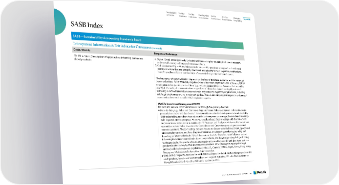 Sustainability For Our For Our Creating Value For the For Our Managing Appendix at MetLife Workforce Customers as an Investor Environment Communities Responsibly SASB Index SASB—Sustainability Accounting Standards Board Transparent Information & Fair Advice for Customers (continued) Code/Metric Response/Reference FN-IN-270a.4, Description of approach to informing customers 4. Digital: Email, social (primarily LinkedIn) and banner/display covering both direct outreach, about products such as with email, and targeted communications. 5. Call Center and Operations: Inbound calls for specific questions or support and outbound communications that are primarily direct mail and take the form of regulatory notifications, benefit enrollment kits or confirmation of account changes such as beneficiaries. The frequency of communication depends on the line-of-business, audience and the nature of communications. RIS is financially regulated due to its nature of products and adheres to ERISA requirements for specific product lines (e.g., with Institutional Income Annuities that are within a 401(k)). As such, all communications regardless of channel or format are legally reviewed following a defined internal process and strict adherence to regulatory requirements, including risk/legal disclosures and no investment advice. There is also ongoing training and monitoring of communications such as with FINRA registered agents. MetLife Investment Management (MIM) Product and service communications occur through five primary channels: • F ace-to-face, e.g., Sales and Customer Support Teams: Sales enablement collateral includes presentation decks and slip sheets. There is usually one standard deck per investment capability. With sales taking anywhere from six months to three years on average, the number of meetings held depends on the prospect. However, usually at least three meetings with the sales team and investment team occur in addition to RFP reviews and final presentation to the investment committee where Sales, Investments, Compliance and Operations present processes and answer questions. These meetings are also forums to discuss potential investment, operational and compliance risks, and how they are monitored. Investment consultants play a big part by acting as intermediaries in 75% of the deals in the U.S. Therefore, MIM follows a path of informing investment consultants about our products, and they assign a buy, hold, sell rating to the products. Prospects who use an investment consultant usually only buy from us if our product is rated a buy by their investment consultant. MIM (through its appropriate legal entities) sells its investment capabilities in the U.S., Canada, EMEA, Japan, Korea, Hong Kong, Singapore, Malaysia and a few other Asian countries. • W eb (MIM): Separate sections for each MIM LOB provide details on the value proposition for each product, investment team members and support materials. We also have sections on thought leadership divided by LOB and a section on ESG. 2021 SUSTAINABILITY REPORT 106