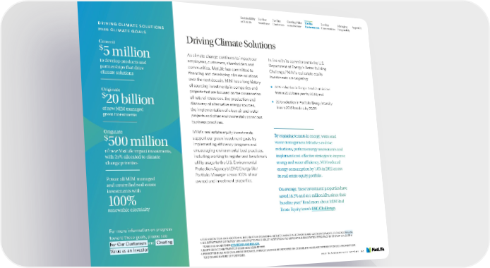 Sustainability For Our For Our Creating Value For the For Our Managing Appendix at MetLife Workforce Customers as an Investor Environment Communities Responsibly DRIVING CLIMATE SOLUTIONS 2030 CLIMATE GOALS Driving Climate Solutions Commit $ As climate change continues to impact our In line with its commitment to the U.S. 5 million employees, customers, shareholders and Department of Energy’s Better Building to develop products and 2 partnerships that drive communities, MetLife has committed to Challenge, MIM’s real estate equity climate solutions financing and developing climate solutions investments are targeting: over the next decade. MIM has a long history of sourcing investments in companies and • 50% reduction in Scope 1 and 2 emissions Originate projects that are focused on the conservation from a 2020 base year by 2030; and $ of natural resources, the production and • 20% reduction in Portfolio Energy Intensity 20 billion discovery of alternative energy sources, 3 from a 2016 baseline by 2026. of new MIM-managed the implementation of clean air and water green investments projects and other environmentally conscious business practices. Originate MIM’s real estate equity investments By engaging tenants in energy, water and $ support our green investment goals by waste management initiatives to drive 500 million implementing efficiency programs and of new MetLife impact investments, encouraging environmental best practices, reductions, perform energy assessments and with 25% allocated to climate including working to register and benchmark implement cost-effective strategies to improve change priorities utility usage to the U.S. Environmental energy and water efficiency, MIM reduced Protection Agency’s (EPA) Energy Star energy consumption by 7.6% in 2021 across Power all MIM-managed Portfolio Manager across 100% of our its real estate equity portfolio. and controlled real estate owned and investment properties. investments with On average, these investment properties have 100% saved 16.3% and 451 million kBtu since their 4 renewable electricity baseline year. Read more about MIM Real Estate Equity team’s ESG Challenge. For more information on progress toward these goals, please see For Our Customers and Creating 1. FOR A DEFINITION AND ADDITIONAL INFORMATION REGARDING METLIFE’S IMPACT INVESTMENTS AND GREEN INVESTMENTS, PLEASE SEE PAGE 90. 2. U.S. DEPARTMENT OF ENERGY-LED INITIATIVE TO ENCOURAGE INSTITUTIONS TO IMPROVE BUILDING ENERGY EFFICIENCY BY AT LEAST 20% OVER 10 1 YEARS AND SHARE THEIR STRATEGIES AND RESULTS. Value as an Investor. 3. BASED ON A COMMITMENT OF 45 MILLION SQUARE FEET. 4. PER BETTER BUILDINGS CHALLENGE GUIDANCE, AVERAGE SAVINGS ARE REPORTED SINCE BASELINE YEARS ARE DIFFERENT FOR EACH PROPERTY DUE TO DYNAMIC NATURE OF PORTFOLIO. 2021 SUSTAINABILITY REPORT 63