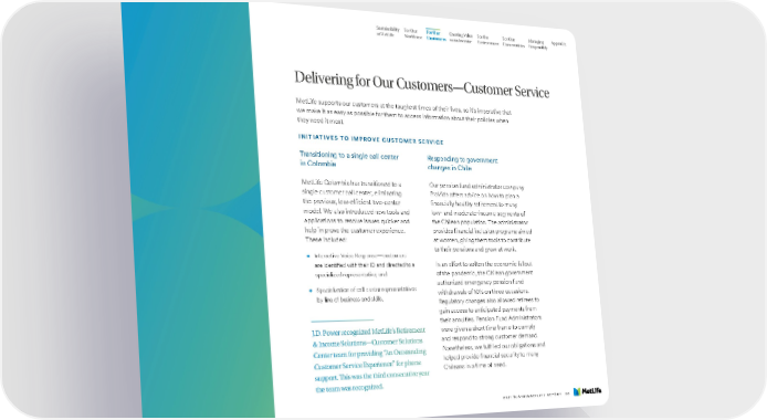 Sustainability For Our For Our Creating Value For the For Our Managing Appendix at MetLife Workforce Customers as an Investor Environment Communities Responsibly Delivering for Our Customers—Customer Service MetLife supports our customers at the toughest times of their lives, so it’s imperative that we make it as easy as possible for them to access information about their policies when they need it most. INITIATIVES TO IMPROVE CUSTOMER SERVICE Transitioning to a single call center Responding to government in Colombia changes in Chile MetLife Colombia has transitioned to a Our pension fund administrator company single customer call center, eliminating ProVida offers advice on how to plan a the previous, less-efficient two-center financially healthy retirement to many model. We also introduced new tools and low- and moderate-income segments of applications to resolve issues quicker and the Chilean population. The administrator help improve the customer experience. provides financial inclusion programs aimed These included: at women, giving them tools to contribute to their pensions and grow at work. • Interactive Voice Response—customers are identified with their ID and directed to a In an effort to soften the economic fallout specialized representative; and of the pandemic, the Chilean government • Specialization of call center representatives authorized emergency pension fund by line of business and skills. withdrawals of 10% on three occasions. Regulatory changes also allowed retirees to gain access to anticipated payments from their annuities. Pension Fund Administrators J.D. Power recognized MetLife’s Retirement were given a short time frame to comply & Income Solutions—Customer Solutions and respond to strong customer demand. Center team for providing “An Outstanding Nonetheless, we fulfilled our obligations and Customer Service Experience” for phone helped provide financial security to many support. This was the third consecutive year Chileans in a time of need. the team was recognized. 2021 SUSTAINABILITY REPORT 36