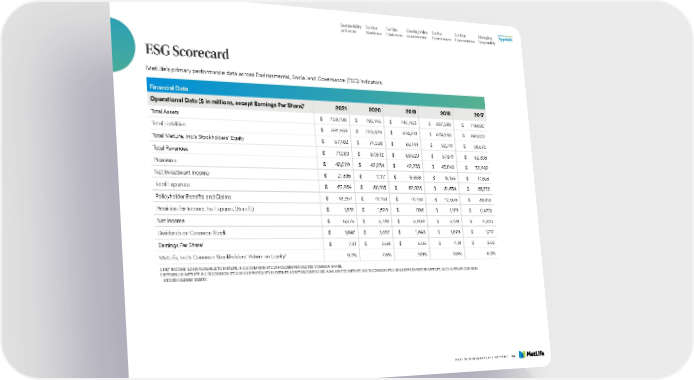 Sustainability For Our For Our Creating Value For the For Our Managing Appendix at MetLife Workforce Customers as an Investor Environment Communities Responsibly ESG Scorecard MetLife’s primary performance data across Environmental, Social and Governance (ESG) indicators. Financial Data 1 Operational Data ($ in millions, except Earnings Per Share) 2021 2020 2019 2018 2017 Total Assets $ 759,708 $ 795,146 $ 740,463 $ 687,538 $ 719,892 Total Liabilities $ 691,959 $ 720,329 $ 674,081 $ 634,580 $ 661,022 Total MetLife, Inc.’s Stockholders’ Equity $ 67,482 $ 74,558 $ 66,144 $ 52,741 $ 58,676 Total Revenues $ 71,080 $ 67,842 $ 69,620 $ 67,941 $ 62,308 Premiums $ 42,009 $ 42,034 $ 42,235 $ 43,840 $ 38,992 Net Investment Income $ 21,395 $ 17,117 $ 18,868 $ 16,166 $ 17,363 Total Expenses $ 62,954 $ 60,915 $ 62,825 $ 61,634 $ 58,772 Policyholder Benefits and Claims $ 43,954 $ 41,461 $ 41,461 $ 42,656 $ 38,313 Provision for Income Tax Expense (Benefit) $ 1,551 $ 1,509 $ 886 $ 1,179 $ (1,470) Net Income $ 6,575 $ 5,418 $ 5,909 $ 5,128 $ 4,020 Dividends on Common Stock $ 1,647 $ 1,657 $ 1,643 $ 1,678 $ 1,717 Earnings Per Share1 $ 7.31 $ 5.68 $ 6.06 $ 4.91 $ 3.62 2 MetLife, Inc.’s Common Stockholders’ Return on Equity 9.7% 7.6% 9.8% 9.6% 6.3% 1. NET INCOME (LOSS) AVAILABLE TO METLIFE, INC.’S COMMON STOCKHOLDERS PER DILUTED COMMON SHARE. 2. RETURN ON METLIFE, INC.’S COMMON STOCKHOLDERS’ EQUITY IS DEFINED AS NET INCOME (LOSS) AVAILABLE TO METLIFE, INC.’S COMMON STOCKHOLDERS DIVIDED BY METLIFE, INC.’S AVERAGE COMMON STOCKHOLDERS’ EQUITY. 2021 SUSTAINABILITY REPORT 134