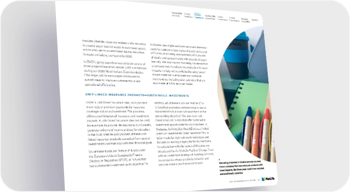 Sustainability For Our For Our Creating Value For the For Our Managing Appendix at MetLife Workforce Customers as an Investor Environment Communities Responsibly booklets, MetLife Japan has realized a 19% reduction In Ukraine, new digital welcome packs and electronic in unused paper booklet waste in warehouse space, cards for customers have replaced plastic policy and which amounts to an estimated 84-ton reduction VIP cards, eliminating approximately 600 pounds in waste emissions, compared to 2020. of plastic and approximately 440 pounds of paper In EMEA, going paperless was selected as one of annually. We now source marketing collateral from three project ideas from almost 1,300 submissions a company that manufactures products with lower during our 2020 Next Horizon Experimentation impacts. In Italy, we’ve switched to using lower- Challenge, which encouraged employees to impact materials in employee and customer submit ideas to improve customer focus and merchandise, including desk calendars that are operational efficiencies. now made of 100% recycled paper. UNIT-LINKED INSURANCE PRODUCTS—SUSTAINABLE INVESTMENTS Under a unit-linked insurance plan, policyholders addition, 40 of these funds are “Article 8,” or make regular premium payments for insurance “a fund that promotes environmental or social coverage and as an investment. The plan then characteristics but does not have them as the offers a combination of insurance and investment overarching objective.” We also have unit- payouts. A unit-linked insurance plan can be used, linked products in Asia that offer sustainable for example, to provide life insurance, build wealth, investment opportunities for policyholders. In generate retirement income and pay for education. Malaysia, AmMetLife’s WealthEnrich, a limited In the Gulf, MetLife policyholders of these unit- premium Investment-Linked Insurance Plan, is linked insurance products can select from several tailor-made for high-net-worth individuals and investment funds that align with their financial goals. focuses on leaving a legacy for family members. Six of these funds are “Article 9” funds under In conjunction with the launch of this plan, we the European Union’s Sustainable Finance introduced the AmMetLife Positive Change Fund Disclosure Regulation (SFDR), or “a fund that with an investment strategy of investing primarily has sustainable investment as its objective.” In in companies whose products, behavior and services make a positive social impact. 2021 SUSTAINABILITY REPORT 35