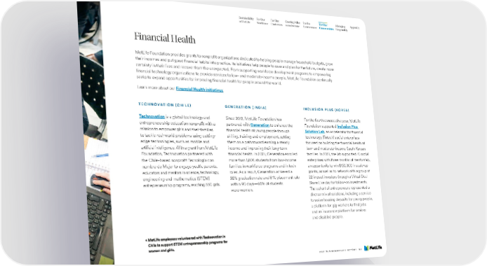 Sustainability For Our For Our Creating Value For the For Our Managing Appendix at MetLife Workforce Customers as an Investor Environment Communities Responsibly Financial Health MetLife Foundation provides grants to nonprofit organizations dedicated to helping people manage household budgets, grow their incomes and put good financial habits into practice. Its initiatives help people to save and plan for the future, create more certainty in their lives and recover from the unexpected. From supporting workforce development programs to empowering financial technology organizations to provide services to low- and moderate-income people, MetLife Foundation continually seeks to expand opportunities for improving financial health for people around the world. Learn more about our Financial Health initiatives. TECHNOVATION (CHILE) GENERATION (INDIA) INCLUSION PLUS (KOREA) Technovation is a global technology and Since 2019, MetLife Foundation has For the fourth consecutive year, MetLife entrepreneurship education nonprofit with a partnered with Generation to enhance the Foundation supported Inclusion Plus mission to empower girls and their families financial health of young people through Solution Lab, an accelerator for financial to tackle real-world problems using cutting- skilling, training and employment, setting technology (fintech) social enterprises edge technologies, such as mobile and them on a path toward earning a steady focused on building the financial health of artificial intelligence. With a grant from MetLife income and improving their long-term low- and moderate-income South Korean Foundation, Technovation partnered with financial health. In 2021, Generation enrolled families. In 2021, the lab supported 10 social the Chile-based nonprofit TecnologĂa con more than 1,600 students from low-income enterprises with three months of mentorship, nombre de Mujer to engage youth, parents, families in workforce programs and in tech an opportunity to win $150,000 in scale-up educators and mentors in science, technology, roles. As a result, Generation achieved a grants, as well as to network with a group of engineering and mathematics (STEM) 92% graduation rate and 81% placement rate 22 impact investors through a Virtual Deal entrepreneurship programs, reaching 550 girls. within 90 days—66% of students Share Live day for follow-on investments. were women. The cohort of entrepreneurs represented a diverse mix of solutions, including a service to waive housing deposits for young people, a platform for gig workers to find jobs and an insurance platform for seniors and disabled people. 2021 SUSTAINABILITY REPORT 67