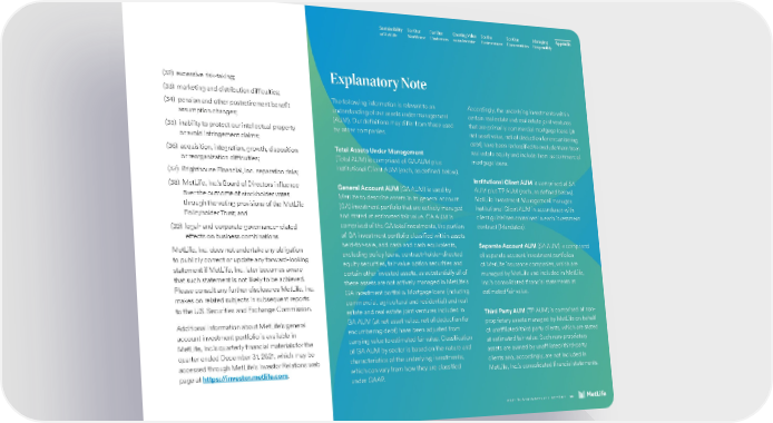 Sustainability For Our For Our Creating Value For the For Our Managing Appendix at MetLife Workforce Customers as an Investor Environment Communities Responsibly (32) excessive risk-taking; Explanatory Note (33) marketing and distribution difficulties; The following information is relevant to an Accordingly, the underlying investments within (34) pension and other postretirement benefit understanding of our assets under management certain real estate and real estate joint ventures assumption changes; (AUM). Our definitions may differ from those used that are primarily commercial mortgage loans (at (35) inability to protect our intellectual property by other companies. net asset value, net of deduction for encumbering or avoid infringement claims; debt) have been reclassified to exclude them from (36) acquisition, integration, growth, disposition Total Assets Under Management real estate equity and include them as commercial or reorganization difficulties; (Total AUM) is comprised of GA AUM plus mortgage loans. (37) Brighthouse Financial, Inc. separation risks; Institutional Client AUM (each, as defined below). Institutional Client AUM is comprised of SA (38) MetLife, Inc.’s Board of Directors influence General Account AUM (GA AUM) is used by AUM plus TP AUM (each, as defined below). over the outcome of stockholder votes MetLife to describe assets in its general account MetLife Investment Management manages through the voting provisions of the MetLife (GA) investment portfolio that are actively managed Institutional Client AUM in accordance with Policyholder Trust; and and stated at estimated fair value. GA AUM is client guidelines contained in each investment (39) legal- and corporate governance-related comprised of the GA total investments, the portion contract (Mandates). effects on business combinations. of GA investment portfolio classified within assets MetLife, Inc. does not undertake any obligation held-for-sale, and cash and cash equivalents, Separate Account AUM (SA AUM) is comprised to publicly correct or update any forward-looking excluding policy loans, contract-holder-directed of separate account investment portfolios statement if MetLife, Inc. later becomes aware equity securities, fair value option securities and of MetLife insurance companies, which are that such statement is not likely to be achieved. certain other invested assets, as substantially all of managed by MetLife and included in MetLife, Please consult any further disclosures MetLife, Inc. these assets are not actively managed in MetLife’s Inc.’s consolidated financial statements at makes on related subjects in subsequent reports GA investment portfolio. Mortgage loans (including estimated fair value. to the U.S. Securities and Exchange Commission. commercial, agricultural and residential) and real estate and real estate joint ventures included in Third Party AUM (TP AUM) is comprised of non- Additional information about MetLife’s general GA AUM (at net asset value, net of deduction for proprietary assets managed by MetLife on behalf account investment portfolio is available in encumbering debt) have been adjusted from of unaffiliated/third party clients, which are stated MetLife, Inc.’s quarterly financial materials for the carrying value to estimated fair value. Classification at estimated fair value. Such non-proprietary quarter ended December 31, 2021, which may be of GA AUM by sector is based on the nature and assets are owned by unaffiliated/third-party accessed through MetLife’s Investor Relations web characteristics of the underlying investments, clients and, accordingly, are not included in page at https://investor.metlife.com. which can vary from how they are classified MetLife, Inc.’s consolidated financial statements. under GAAP. 2021 SUSTAINABILITY REPORT 149
