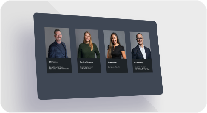 Bill Harmer Caroline Brayson Cassie Chao Chris Massey Operating Partner, Operating Partner, Director, Talent Operating Partner, Security | San Francisco Communications Government Relations, Social Impact, and DE&I