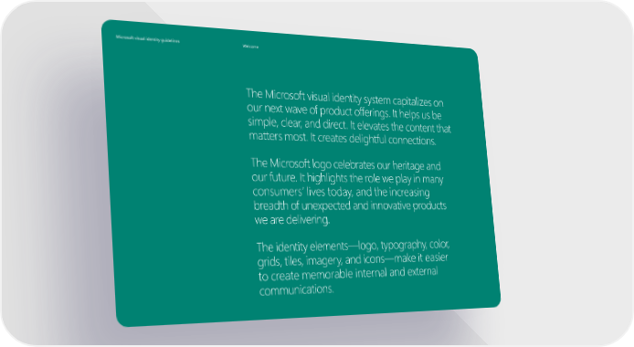 Microsoft visual identity guidelines Welcome The Microsoft visual identity system capitalizes on our next wave of product offerings. It helps us be simple, clear, and direct. It elevates the content that matters most. It creates delightful connections. The Microsoft logo celebrates our heritage and our future. It highlights the role we play in many consumers’ lives today, and the increasing breadth of unexpected and innovative products we are delivering. The identity elements—logo, typography, color, grids, tiles, imagery, and icons—make it easier to create memorable internal and external communications.