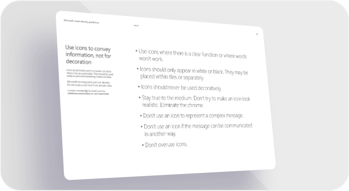 MicrMicrosoosofft visual identity guidelinest visual identity guidelines 57 Icons Use icons to convey • Use icons where there is a clear function or where words information, not for won’t work. decoration • Icons should only appear in white or black. They may be Icons are primarily used in onscreen scenarios where they are actionable. They should be used placed within tiles or separately. rarely in print and marketing communication. Microsoft has many icons and icon libraries. Do not create a new icon if one already exists. • Icons should never be used decoratively. Contact [email protected] for additional information or visit BrandTools. • Stay true to the medium. Don’t try to make an icon look realistic. Eliminate the chrome. • Don’t use an icon to represent a complex message. • Don’t use an icon if the message can be communicated in another way. • Don’t overuse icons.