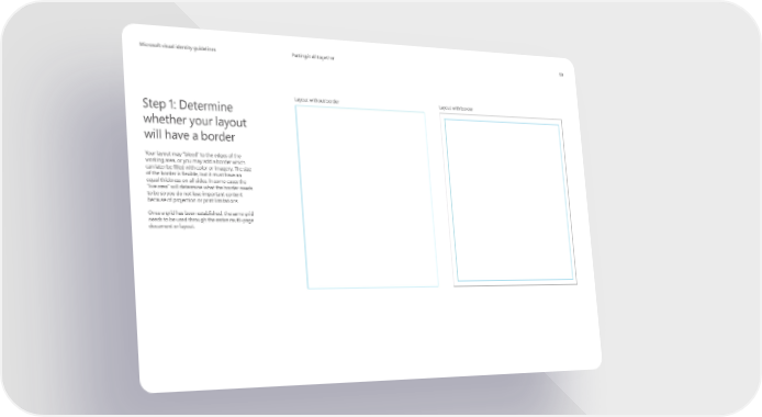 MicrMicrosoosofft visual identity guidelinest visual identity guidelines Putting it all together 59 Layout without border Layout with border Step 1: Determine whether your layout will have a border Your layout may “bleed” to the edges of the working area, or you may add a border which can later be 昀椀lled with color or imagery. The size of the border is 昀氀exible, but it must have an equal thickness on all sides. In some cases the “live area” will determine what the border needs to be so you do not lose important content because of projection or print limitations. Once a grid has been established, the same grid needs to be used through the entire mutli-page document or layout.