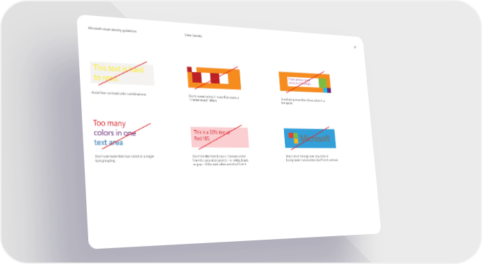 MicrMicrosoosofft visual identity guidelinest visual identity guidelines Color (don’ts) 37 This text is hard There are too many colors in this design. to read. Avoid low-contrast color combinations. Don’t repeat colors in ways that create a Avoid using more than three colors in a “checkerboard” effect. tile layout. Too many This is a 20% tint of colors in one Red 185. text area Don’t tint the brand colors. Choose a color Don’t place the logo over any color or Don’t use more than two colors in a single from the secondary palette—or white, black, background that provides insuf昀椀cient contrast. text grouping. or gray—if the core colors aren’t suf昀椀cient.