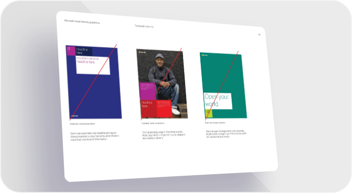 MicrMicrosoosofft visual identity guidelinest visual identity guidelines Typography (don’ts) 30 IT Headline here. Incorrect second headline here. Entil aut eos cor aut porro id exerup fugia dicatur? Kuiae pliscid quod quia doluptatur modiscidem volup taque aboresequis nihicim comnis cus qua mil ex et es aut et Open your Sentis aut eos cor aut porro id exerid Headline fugia dicatur? Quiae pliscid quod quis soluptatur modiscidem voluptaque por world. aboresequis nihicim comnis cus duam here. mil ex et es aut et HR Internal communication External communication Internal communication Don’t use more than one headline per layout. Don’t place body copy in more than one tile. Don’t set type too large within a tile. Generally, Always maintain a clear hierarchy when there is Body copy within a single tile may be arragned headline text no larger than 75% of the tile width more than one level of information. into multiple columns. will provide the best results.