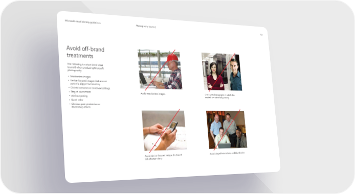 Microsoft visual identity guidelines Microsoft visual identity guidelines Photography (dont’s) 53 Avoid off-brand treatments The following is a short list of what to avoid when producing Microsoft photography. • Emotionless images • Device-focused images that are not part of a bigger human story • Clichéd scenarios or contrived settings • Staged interactions Avoid emotionless images. Don’t use photographs in which the models are obviously posing. • Obvious posing • Bland color • Obvious post-production or Photoshop effects Avoid device-focused images that don’t Avoid staged interactions and bland color. tell a human story.